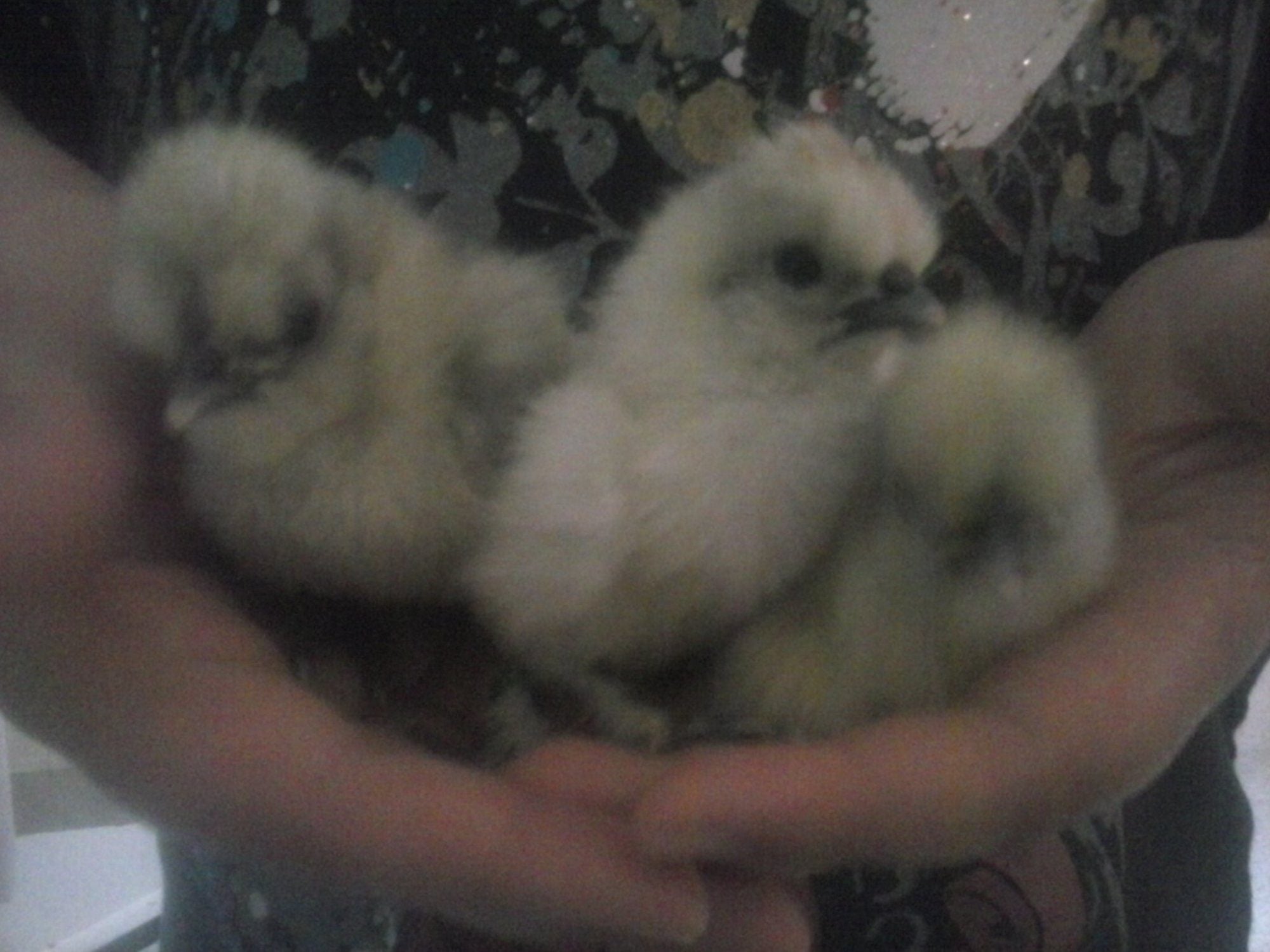 These are the 3 I hatched last week. Momma is a splash polish. Daddy is a blue partridge silkie. Babies are dark skinned, feather footed, smooth feathred & splash colored. Toe counts vary. The 2 new babies both have 10. The 3 here have 8, 9 & 10.