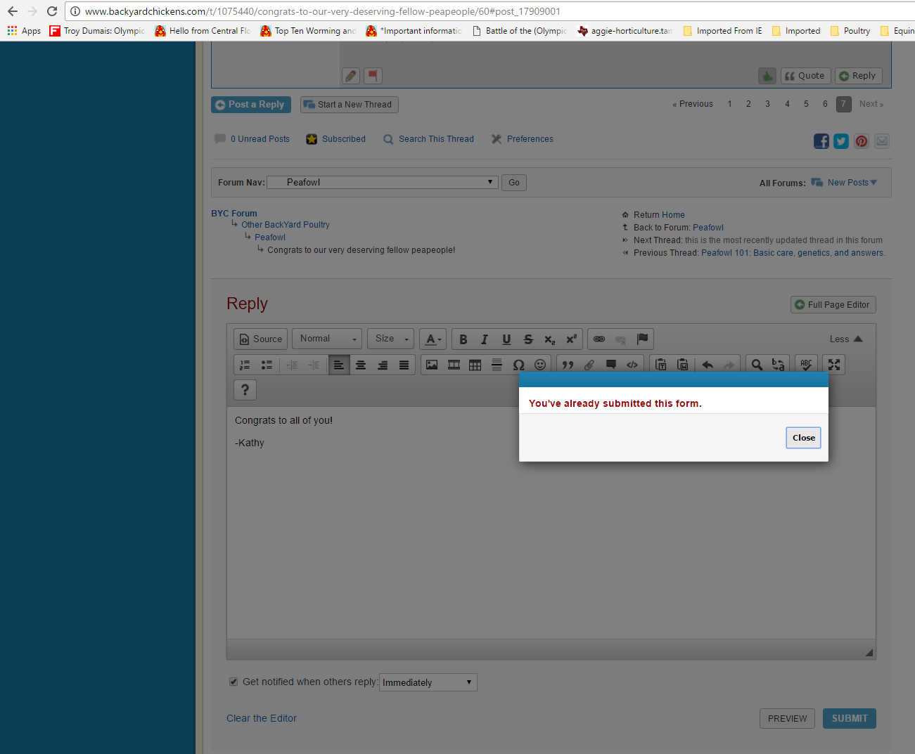 Another tid-bit of info for when it happens, until we know for 100% sure that the bug has been fixed. When the "you've already submitted this form" thingy comes up, wait a second or two. At the bottom of the screen the "1 new post" deelie will pop up. Click on it and you'll see that the new post is yours, so you know it was submitted correctly. When you go to leave that page, you'll likely get the doohicky that asks if you want to leave or stay on the page. Pick either door number one or door number 2, assured that your post is indeed there!