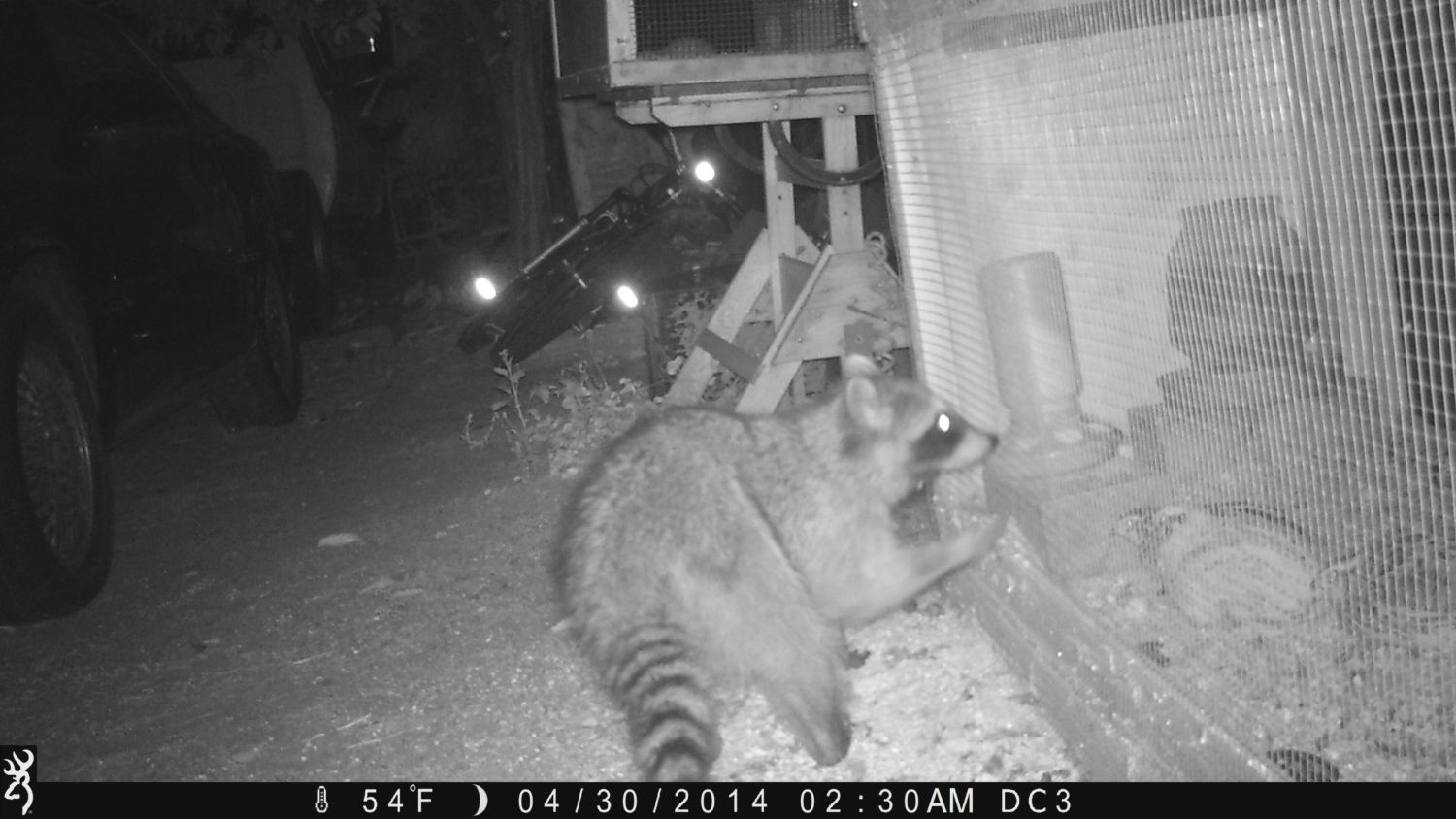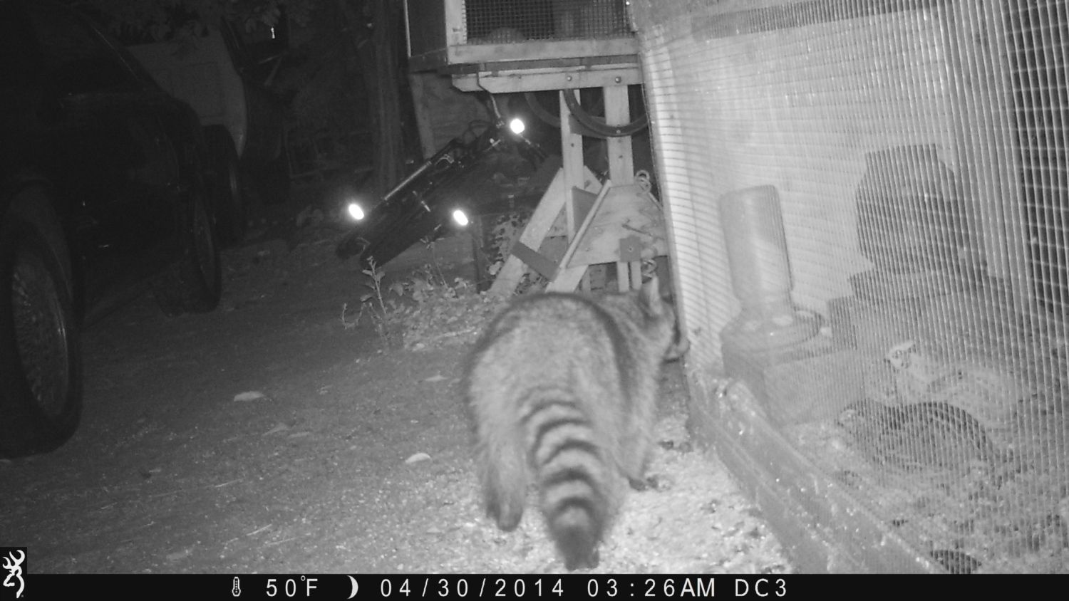 I set up a game cam on a cage wrapped in hardware cloth to see just how that stupid raccoon got so many of my birds earlier this month. Turns out they actually go up to him to investigate what he is doing. There were a ton of pictures but below are the pertinent ones. Notice the time stamps on the pics. This one raccoon spent 1 hour and 12 minutes trying to get into the same cage.