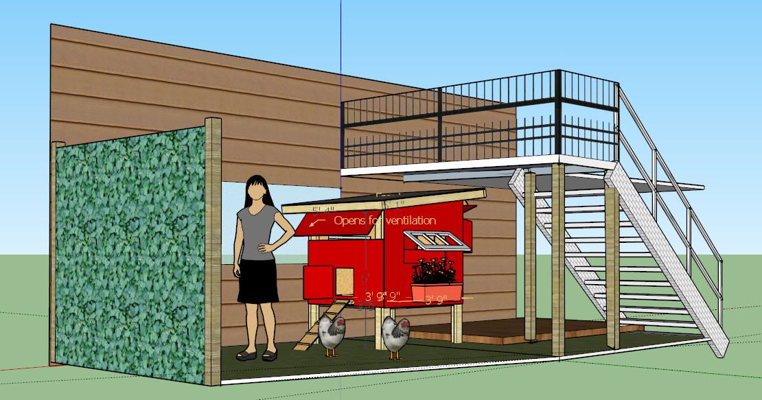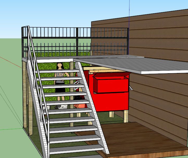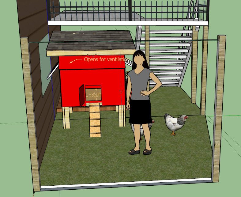 Looks great. Just make sure you leave at least a 3 inch space between the walls and the roof, all the way around, to maximize your ventilation. Nice and sheltered location, with pre-existing wind blocks. Are your stairs open like that in real-life? If so, you will need to use something to keep the chickens from escaping through there.
