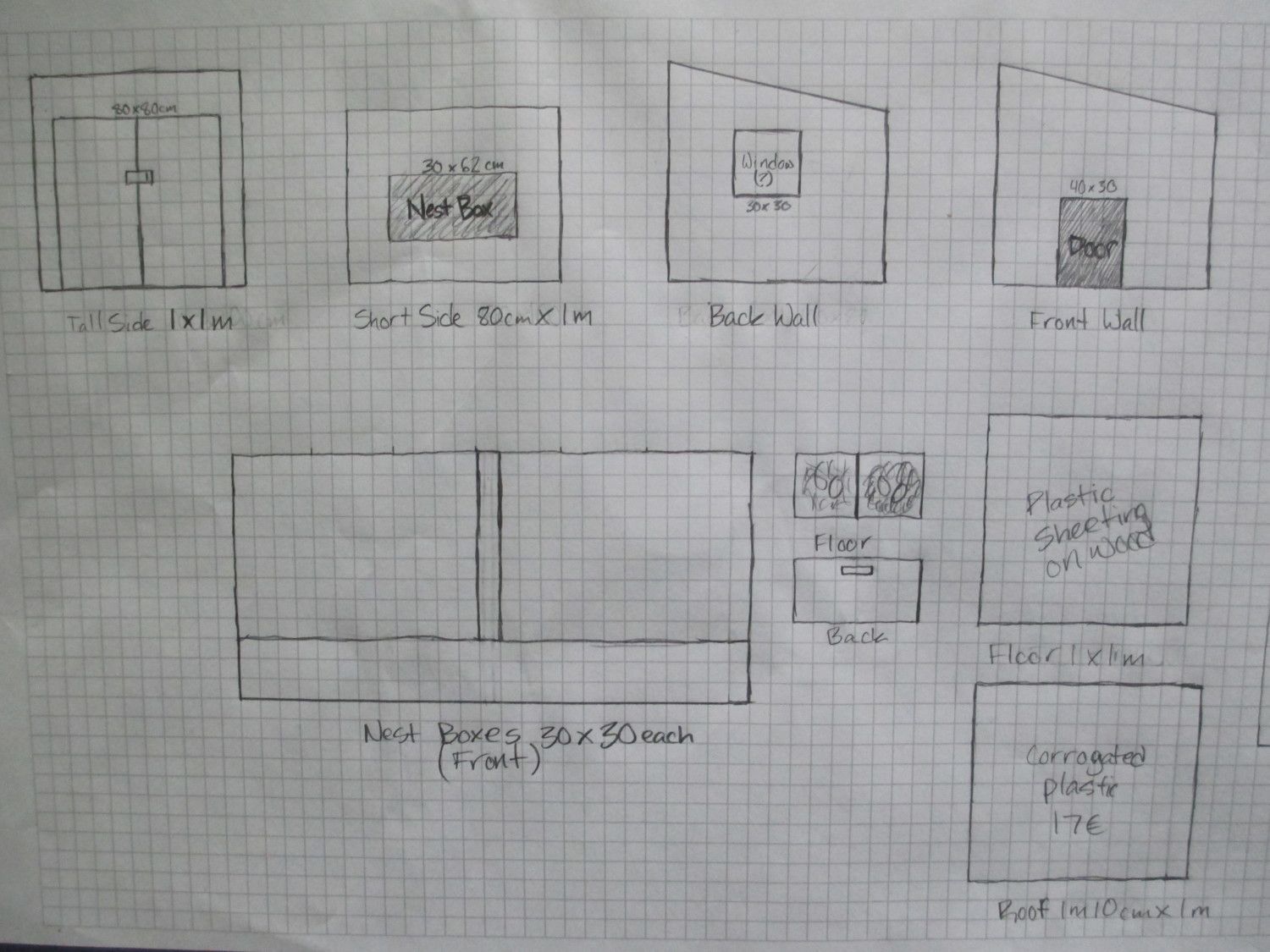 I decided I was fed up with the prefab coop and went about researching and designing a new one. It'll be the same size, about 1square meter, amd will feature a slope roof instead of pitched. Husband owns a kitchen contracting business with his father and mother so lumber will probably cost us nothing. We decided on a clear courrogated pvc roof to let in light and cut cost on the roofing. The plastic's wavy nature will hopefully also help with venting. The plan is two nest boxes and roosts for the hens, and the whole coop up on either bricks or stilts.