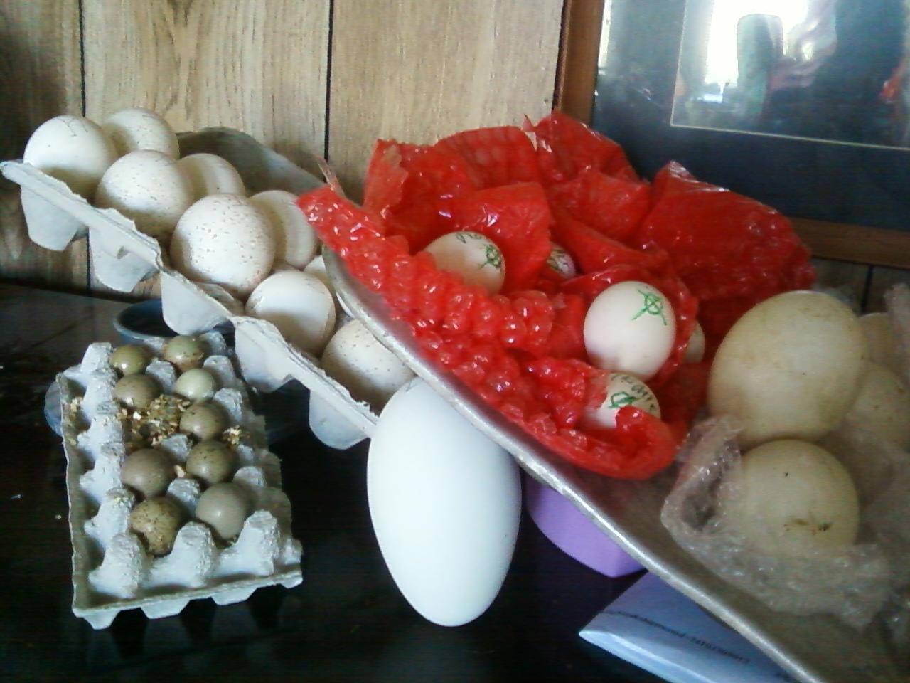 There are 13 turkey eggs, 4 goose eggs (one shown, and sebbie eggs due next week early), 7 E=Old English Game bantem (silky due next week), 9 button quail, and 13 muscovey ducks.