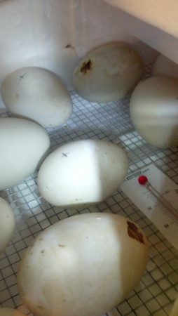 We have quite a few more that have pipped externally, and yet another on the wrong end. We candled all the eggs this afternoon, and we have quite a few more that seem to have pipped internally.