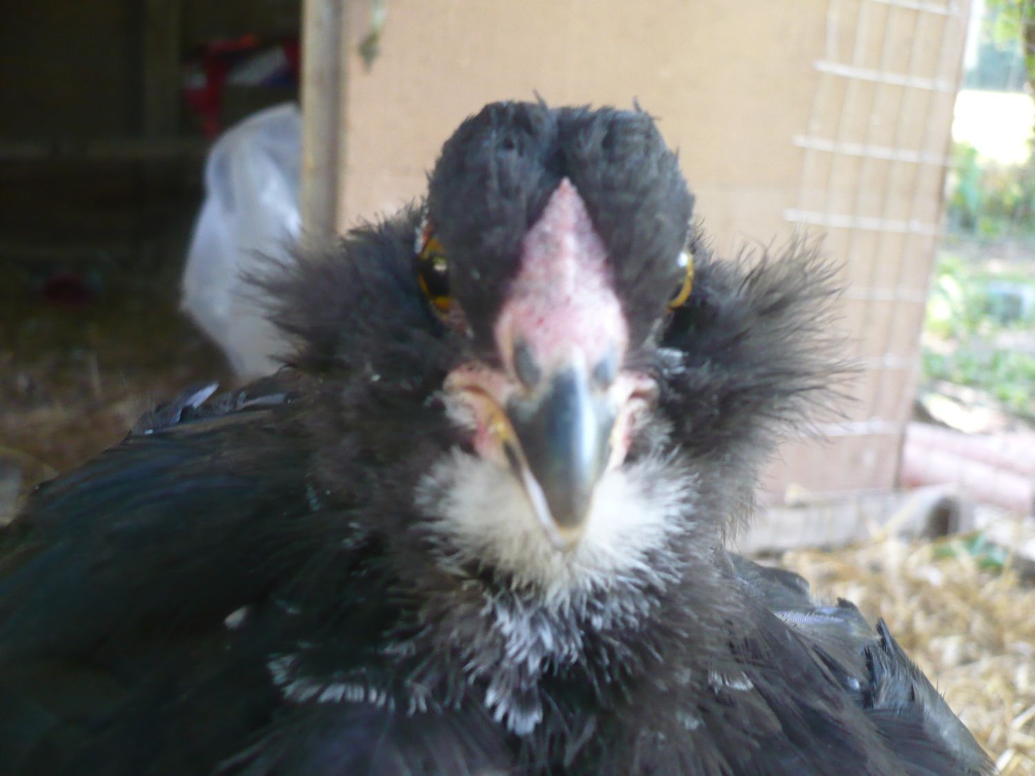 Remember my ugly little black EE chick? It has finally got feathers, although still not as much as everyone else. I'm also still clueless as to if it's a boy or girl, but have decided to keep it either way because it's turning into a pretty neat looking chicken. It has a white beard, lol. Anyone want to help guess if it's a boy or girl?
