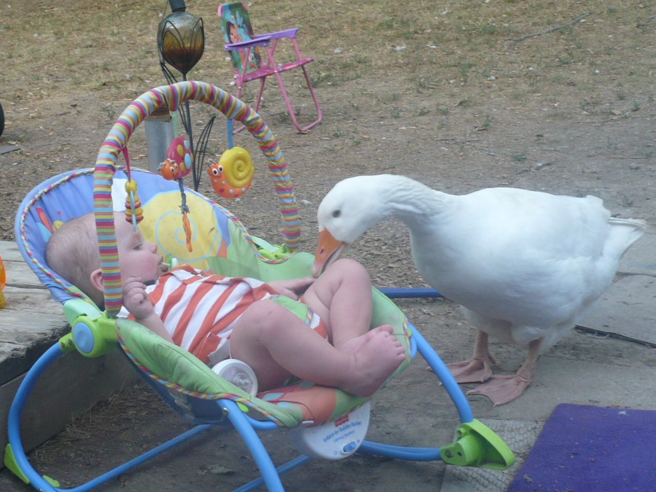 My goose has become quite the babysitter.She has also started teaching everyone to come to the front door to beg for treats too. And 20 or so birds (not counting the babies) doesn't seem like a lot when they are spread out over an acre, but it sure does seem like a lot when they are all gathered around the front door.![]()