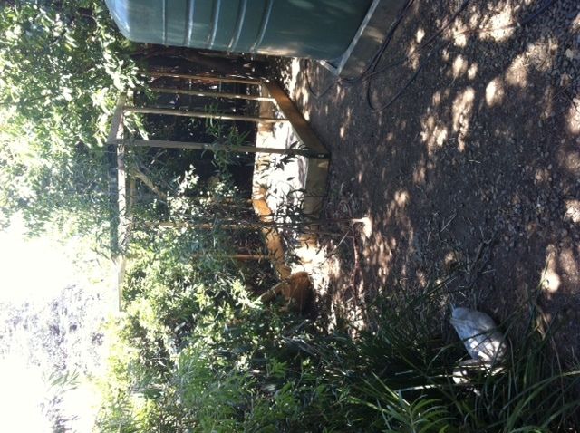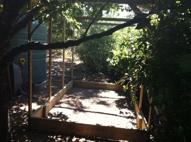 I got the frame up. In the process I mashed my hand a bit when one of the roof beams came off a bracket and swung down and squashed my hand. Well, it's not done right if you don't injure yourself.
