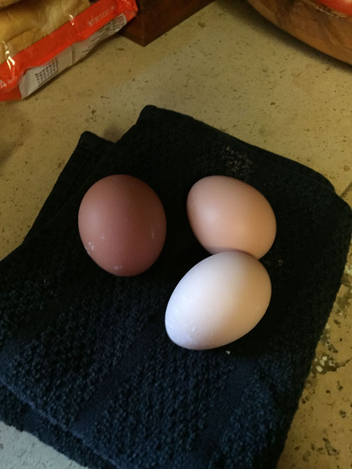 Now have 3 laying. Red sex-link laid at 24 weeks and golden laced Wyandotte at 25 weeks. FINALLY, at 30 weeks, barred rock gave us an egg (pale and kinda speckled). Still waiting on my welsummer and easter egger! It's like having an easter egg hunt every day! These are my first chickens and I'm just so excited. Fun determining who is laying by color --glad I have all different breeds. AND they all three laid so nicely in separate boxes this morning. I've been afraid they were too small but apparently not. (old kitchen cabinets that we built into the coop). They aren't using the larger box area which I thought they'd prefer-- a bit larger, darker and in the corner about 1 foot off the floor. They have 4 boxes (with curtains, naturally LOL) but they are barely 12" tall and nearly 3 feet off the ground, slightly higher than the roost. They do seem to like them though. Must be the cute curtain (and everybody laughed at me for those). Wyandotte did lay a couple on the floor of the coop, but now always lays in the box. Also.... my rooster is GONE. Hate it, but he was getting a little noisy and a bit aggressive with me (only me). Lucy, the red-sex link hasn't skipped a beat--she is TOTALLY top of the pecking order. She thinks she's a rooster. Her egg is the darker brown. Can't wait to see the welsummer and easter egger's eggs! Should be a beautiful array of color.
