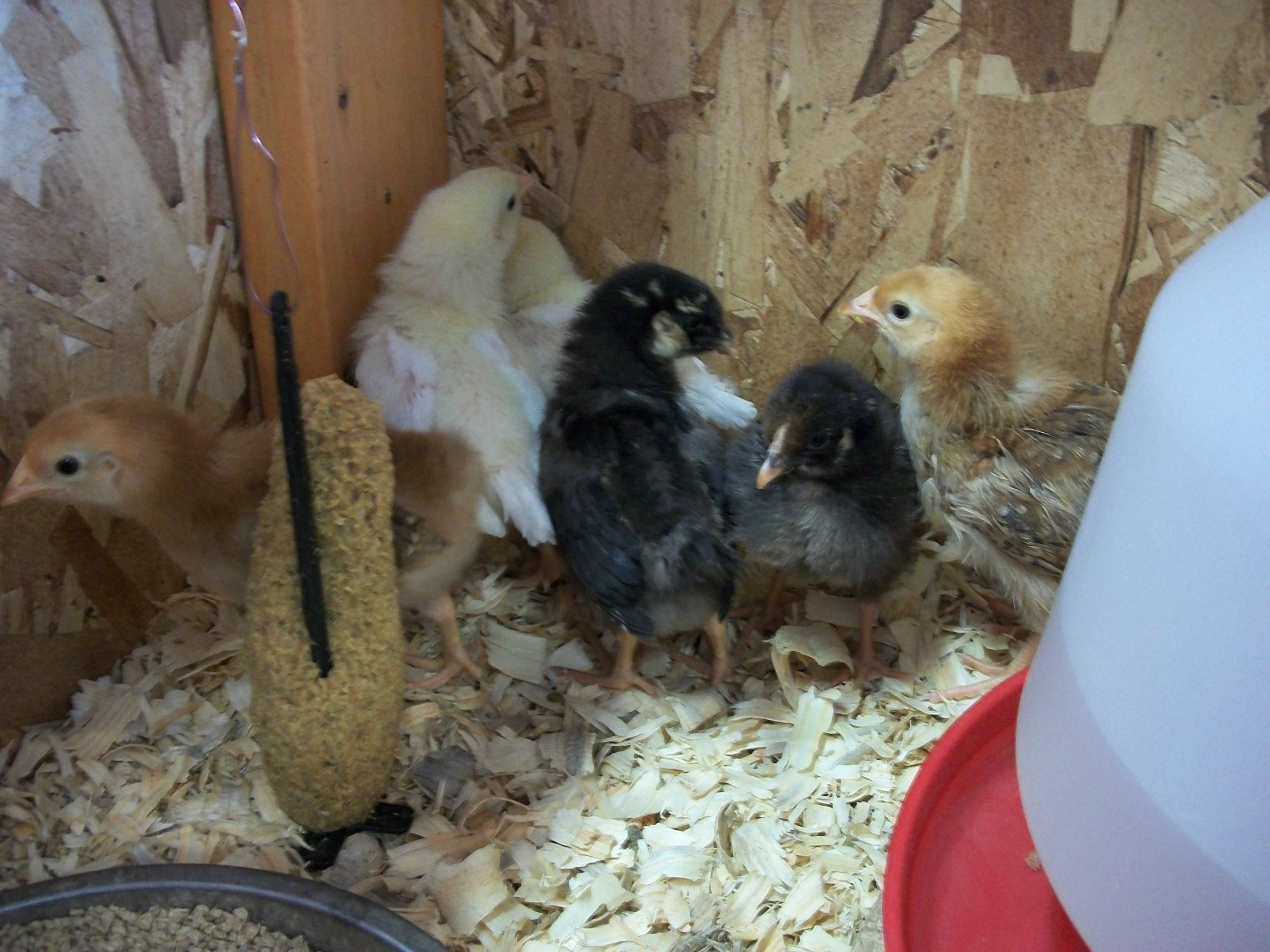 We decided to buy some chicks that were all about the same age, three weeks old. We got five: a brauma, delaware, blue, and two buff orpingtons. They are all pecking each other and one of the buffs is bleeding-- I can't pluck the feathers, I've been "plugging" the pin feathers with starch.