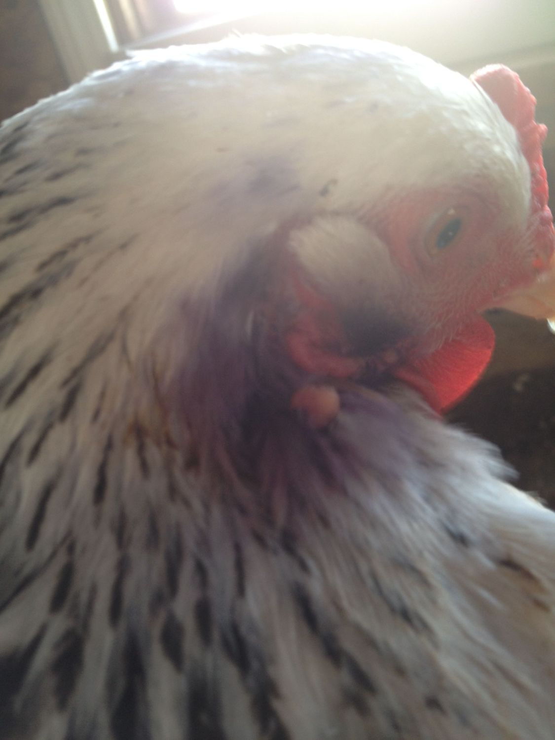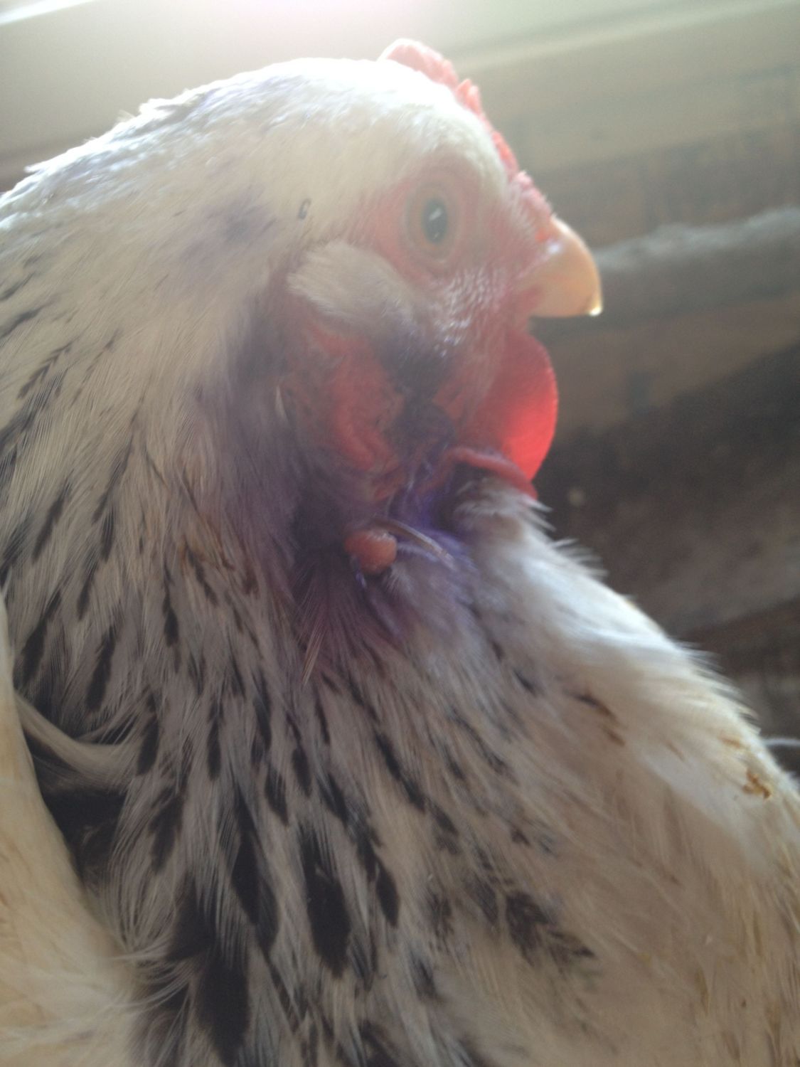 This hen was hurt by a rooster and the skin under her ear was torn almost completely off except for a flap of skin. I originally thought that I would have to cut it off, but I waited to see if it would shrivel up itself and either fall off or be easier to cut off. It didn't fall off, but it did shrink. It is completely healed, she is free of scabs and blood but I'm worried that the flap might attract picking.