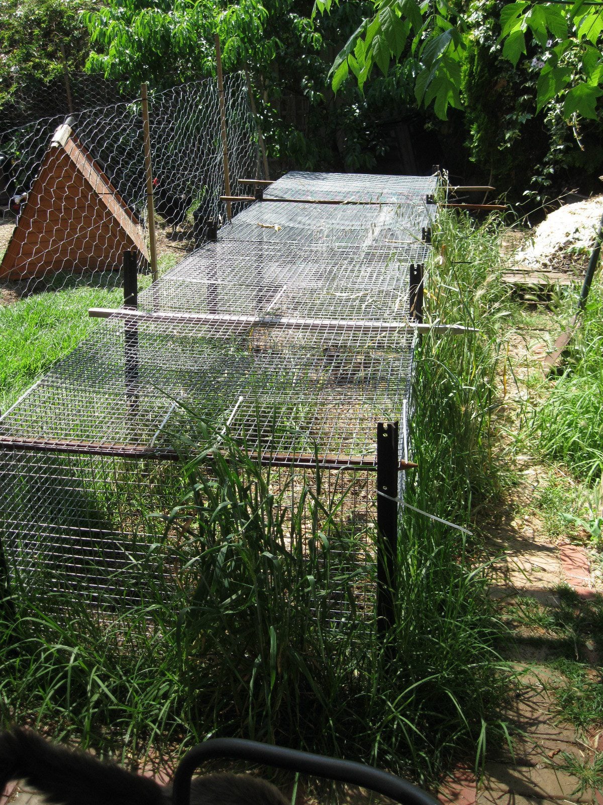 The area the cage was built on use to be filled out garden law but deteriorated rapidly after the quails were introduced. Large tufts of what I think is rye grass survive in both sections. Apart from that the ground is mostly bare although when a section is allowed to recover lawn grass (I'm not sure the species) begins to grow. It doesn't take long for manure to build up and cakes when it rains then dries into a hard surface layer. I remove it by breaking off pieces and removing them after it dries enough to crack. When dry I just gather the manure with dirt, sift out the dirt then put the manure on the compost pile. Eggs can be in difficult and awkward positions to reach with these cages and likewise cleaning the manure. There's also a small shelter build from an upside down apple crate with a plank removed on the top. A separate a frame roof just sits on the top, it's heavy enough so it doesn't fall over. Chicken wire is affixed over the bottom and is covered with pine shavings/straw, if I see any eggs in there I remove the roof to collect them.