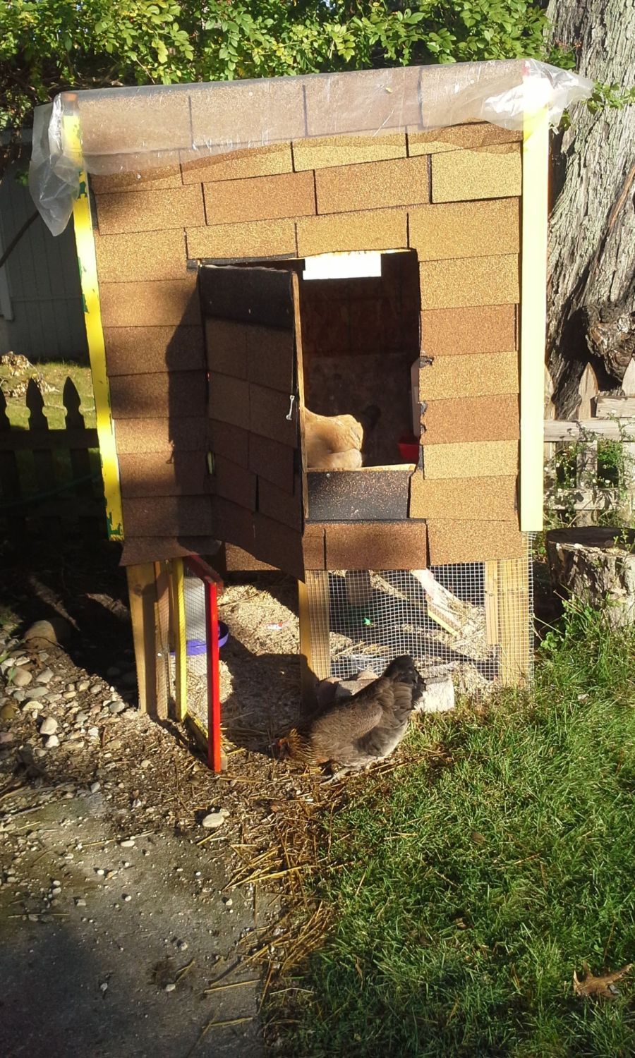 It is basically a 4 foot x 4 foot box on stilts. It's 6 feet tall. We used plywood for the walls, floor and roof (not the nice plywood, but the stranded unfinished stuff), 4x4 posts for the four corner stilts, caulked all the seams, then shingled the entire structure to give it some water proofing capability There's a plastic tarp on there because the roof started dripping in one area. We have since found the leak and caulked it, but haven't taken the tarp off yet. We cut out a door in front for feeding and cleaning access, and cut a pop door in the middle of the floor inside so they could go out into the fenced area underneath using a little ramp. There is a house vent on one side and we cut out a window opening on the back side and used chicken wire to cover it. My nest box is a dishpan bolted to scrap 4x4 for stability and filled with straw. The wood we used was mostly scrap stuff laying around, including some already painted 1x2 scraps we had. The roosts are made of what we had available, in a ladder type design. It's completely uninsulated, but from what I read, this shouldn't be a problem as I have easter eggers which are supposed to be cold-hardy (I hope). I live in Southwestern Michigan, so the winters can get kind of harsh. I enclosed the bottom of the pen with hardware cloth and dug it down about 6 inches to keep predators out. We live on a lake and not far from the woods, so predators were a concern. We have coyotes, racoons, hawks and snakes, although the only thing I have personally seen are garter snakes and black water snakes which hang out by the lake area catching frogs. Occasionally, I see roadkilled racoons and only once a roadkilled coyote, although I haven't seen any live ones and my yard is fenced. Still, I think the hardware cloth is a good choice just in case. I let the chickens outside every morning and out of the bottom pen when I am home so they can roam the fenced yard freely to forage during the day.