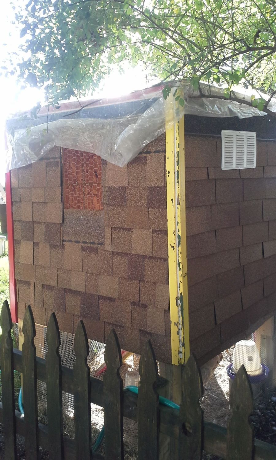Chicken wire covered window and vent. Rain leak prevention tarp