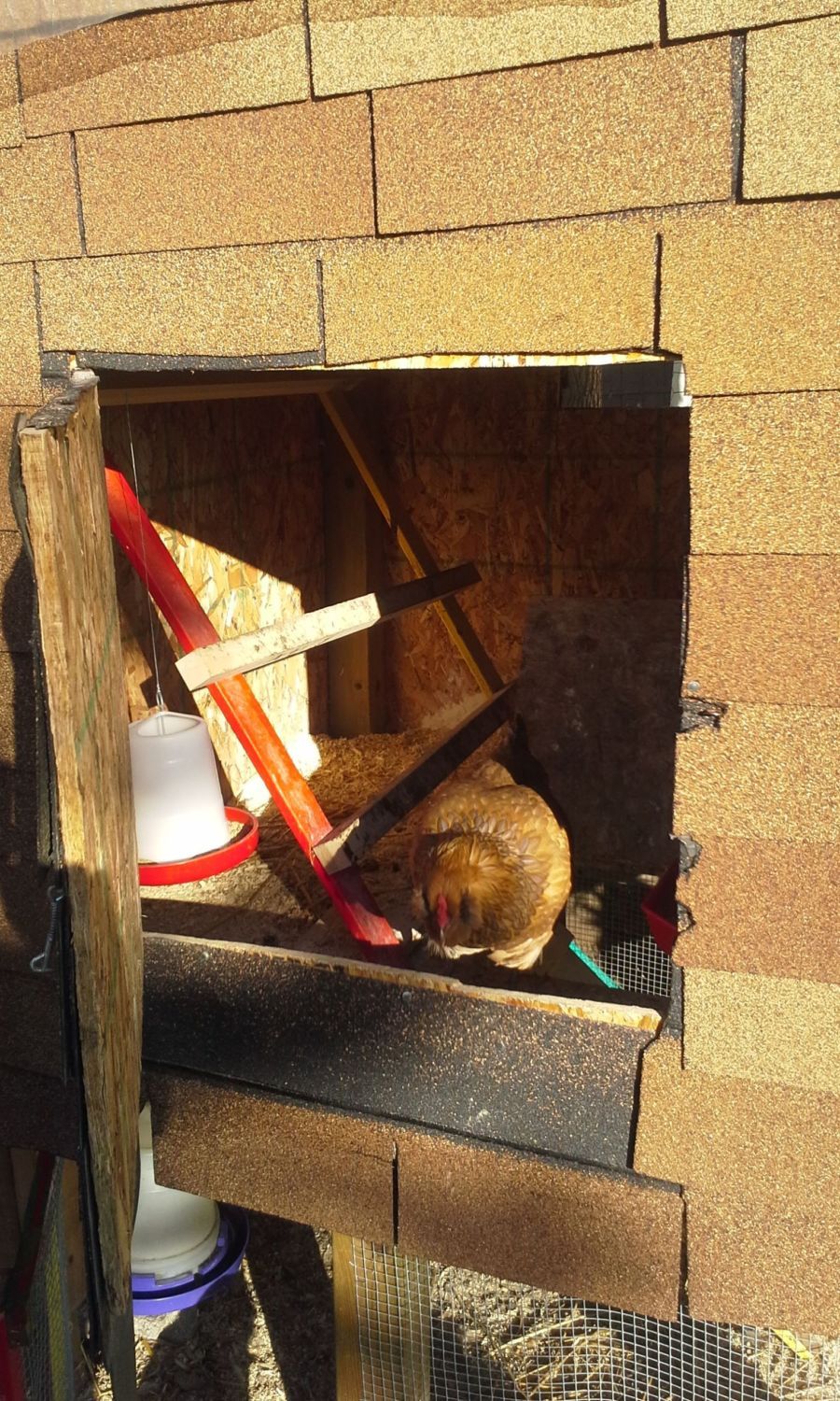 I guess since this is the first time I have ever had chickens, that I am worried that the coop will not be good enough for winter. We got the two chicks in the spring after my daughter fell in love with them at the feed store around Easter in April this year. One has just started laying this past week, and the other one looks like she wants to lay, but hasn't yet. I have been reading that the chickens should be able to keep themselves warm in the coop with their body heat and breath, but since there is only 2 of them, the coop is kind of big for them so I don't know if the coop will keep warm enough. I also worry that the window we cut out will let too much cold in, or if I should cover it with plastic in winter. Then I worry that there won't be enough ventilation if I cover the window. I was also thinking to put a shutter/awning on the cut out window (basically a square of wood, hinge it at the top, hold it open via a wire and a hook) so we could shut the shutter if it gets too cold, when it's snowing really badly or raining, etc.