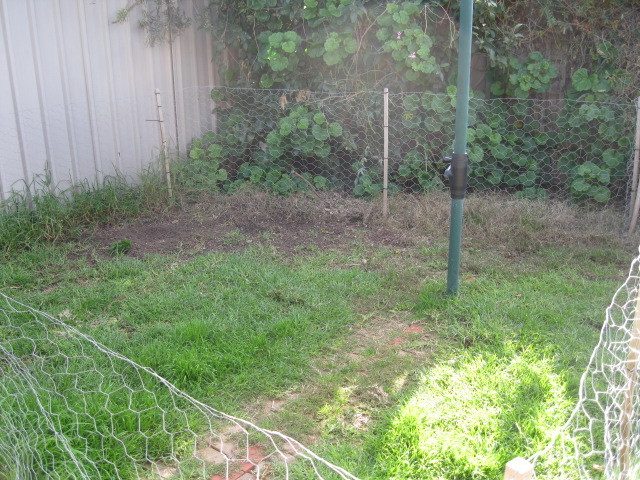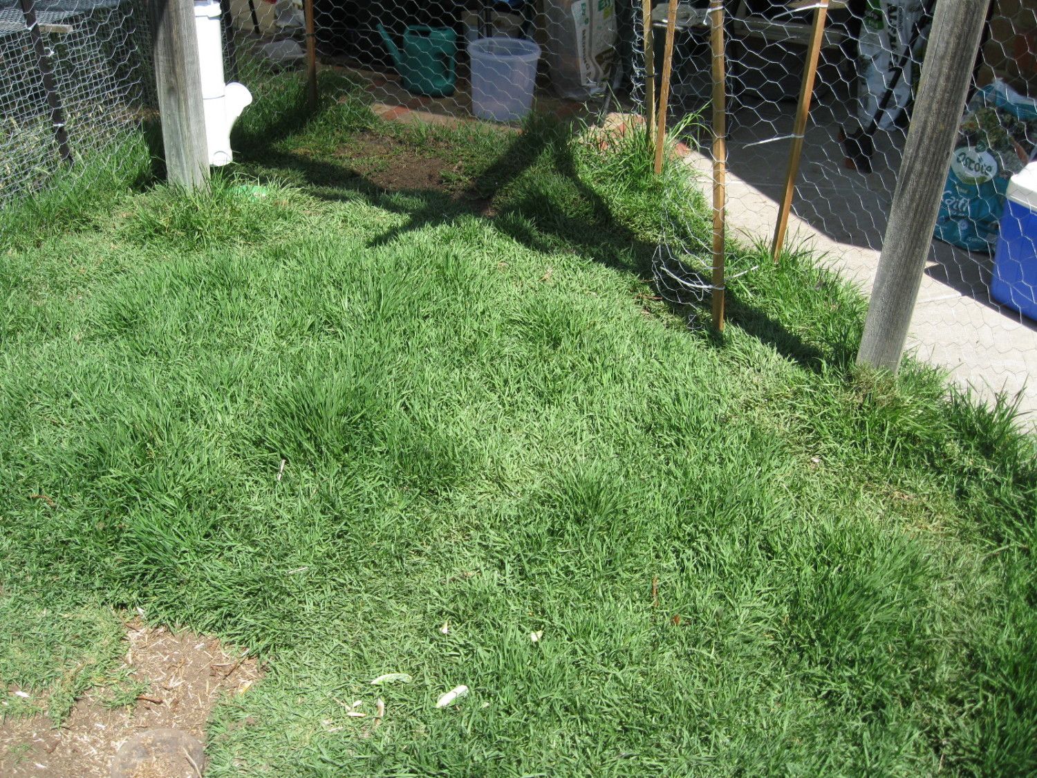Basically my system consists of the lawn area in my backyard, which is quite small as you can see from the photos. Therefore it's split into only 2 halves so one half can regenerate while the other half is grazed. There's only 2 chickens a bantam Australorp and a French Maran. I don't graze for any specific amount of time I just change pastures when grass is at a low level and at a higher level in the other pasture. Or when it looks like one pasture needs time to recover. As you can see a good portion of the pasture is dug up and bare, but there always seems to be enough grass to sustain them. I see them grazing often, most of the grass is couch grass I believe, there's not much clovers or other grasses around. But there is some medic/clover, barley grass, tall wheat grass and rye grass around, usually on the edges of the fence.