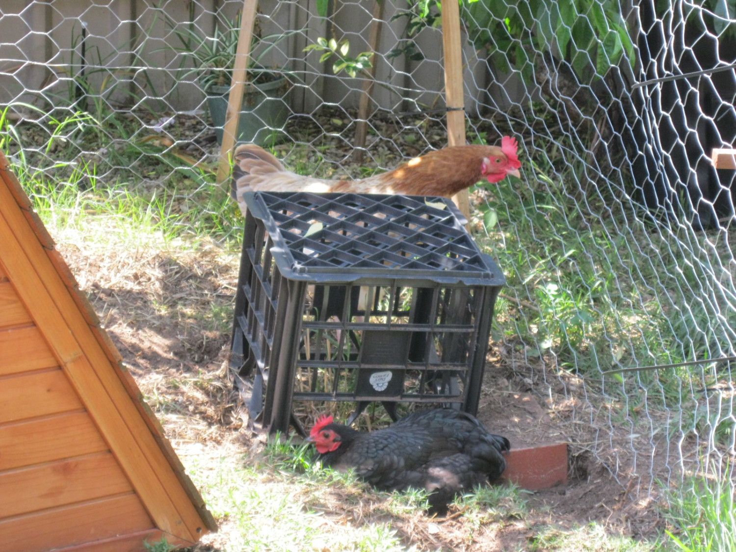 The water-er is a 20L container attached to a pipe with two cups that fill up automatically with a simple float mechanism. I keep it on a bit of cut pallet to keep it off the ground to prevent dirt, etc. Also it stops them from scratching the bit of ground and grass can grow underneath still. I keep it at the back as that is the most shaded area, also it's the most dug up area so it helps with that too. I plan on swapping to a white container instead of black so the water won't be really warm on hot days.