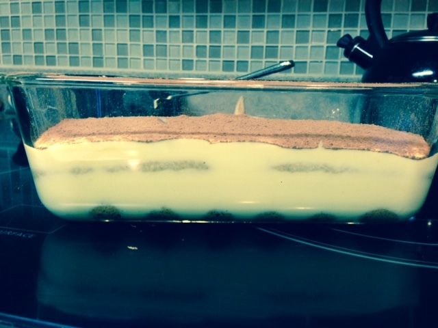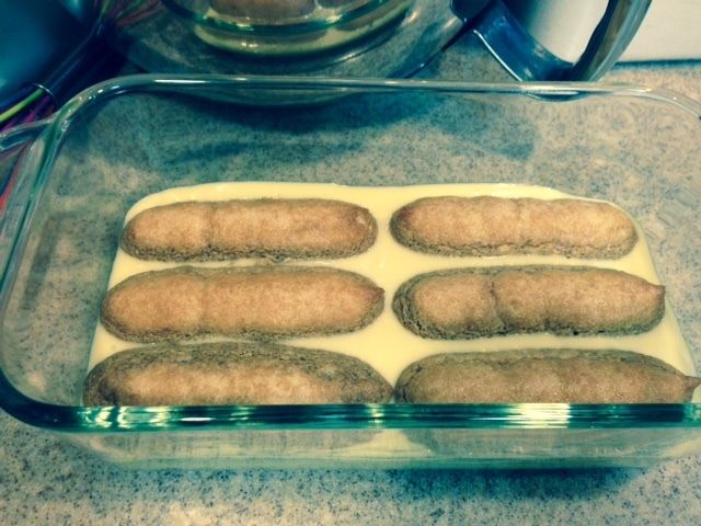 In a separate bowl, mix the espresso and vermouth. Dip the lady fingers in the espresso mixture for a couple seconds. Layer snuggly in a dish, top with half the mixture - repeat.