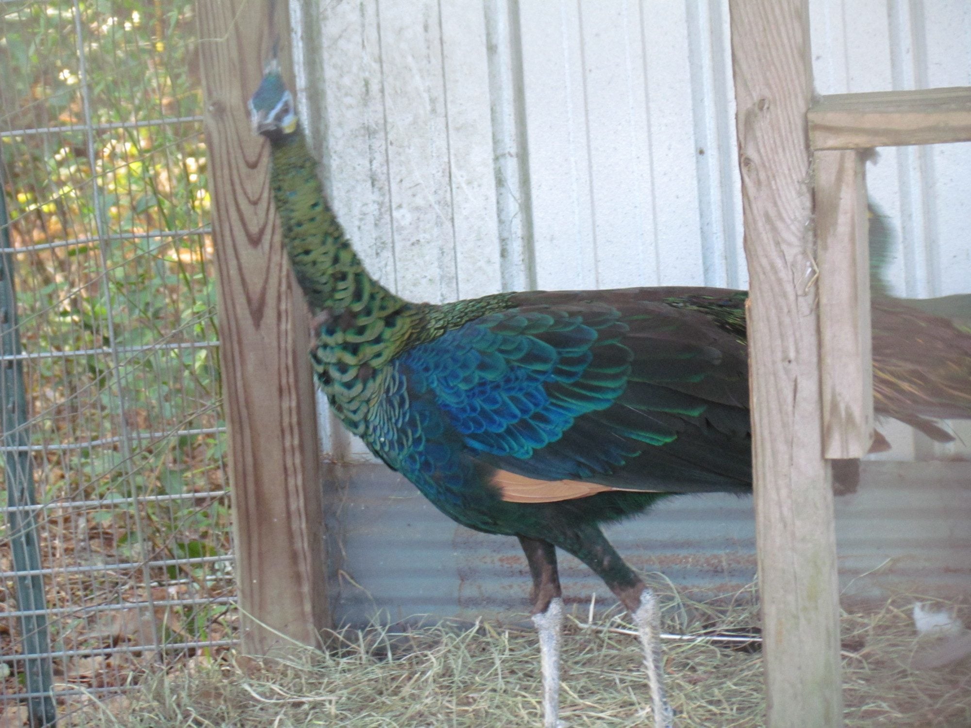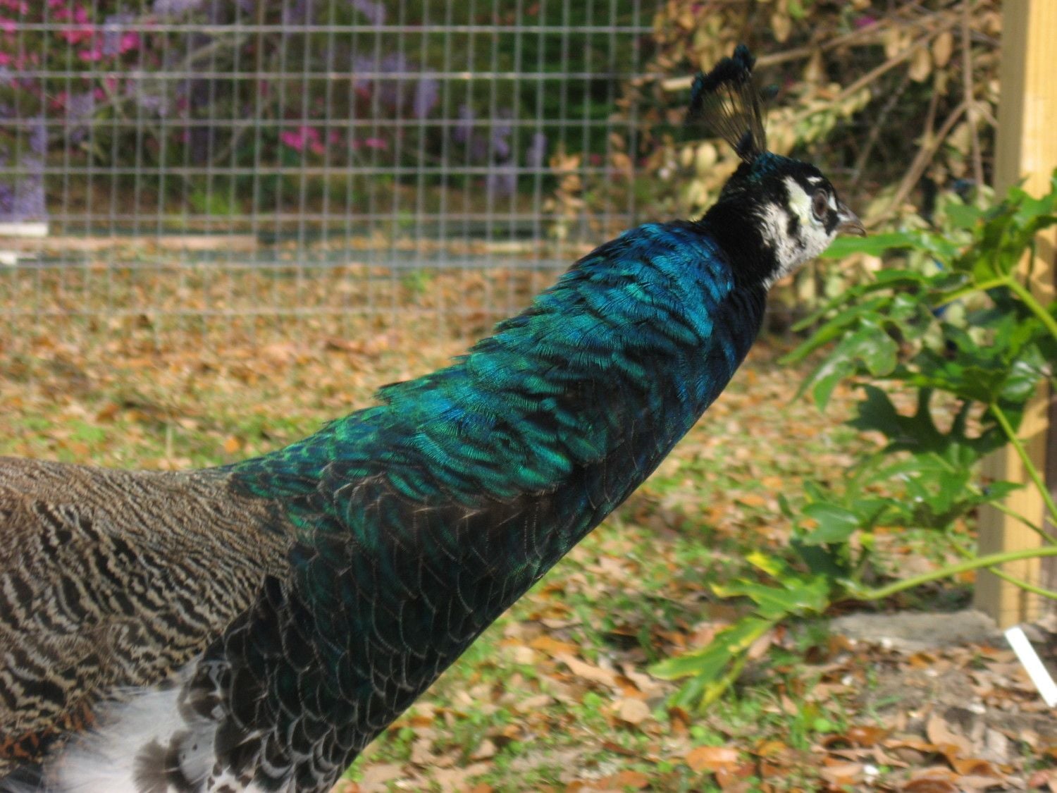 This is a photo (not my bird) of a green peacock for comparison. Generally people say not to free-range green peafowl because they are more close to being wild than India Blues. They are also endangered and more valuable so yet another reason why people generally do not free-range them. Still, I hear of people who have free-ranged them with some luck. They do wander further if you were to free-range one. Green peacocks will have green necks with scaled neck feathers. A spalding's scale neck feathers will be less pronounced. Green peafowl don't really shine blue on their necks at all. A spalding is almost always a blue-green color, but there are high % spaldings that look almost just like a green peacock.