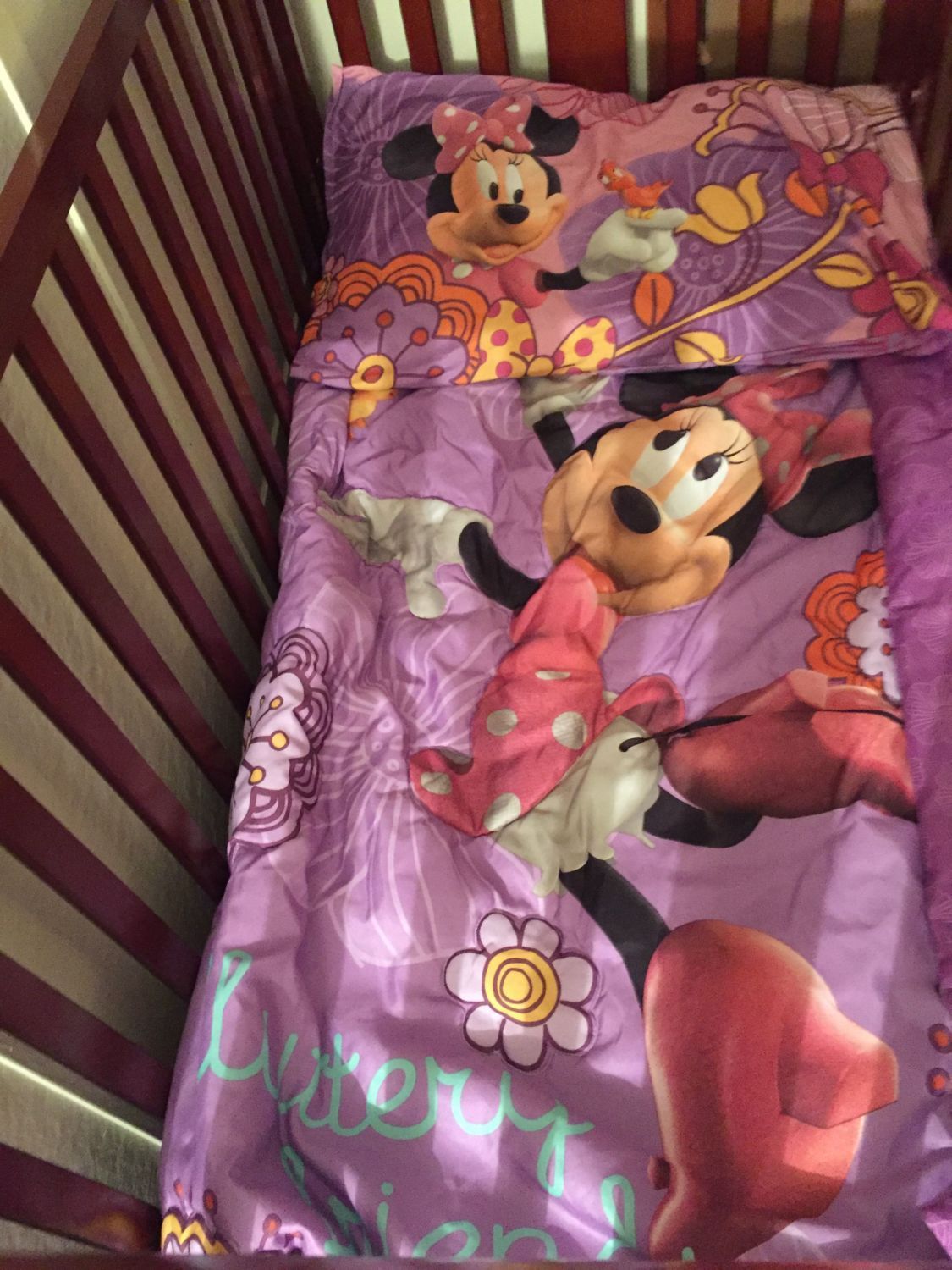 Her shirt was damp, but the bedding seems dry. I didn't bother checking thoroughly. I wanted an excuse to change to the Minnie Mouse bedding. Lighter comforter.