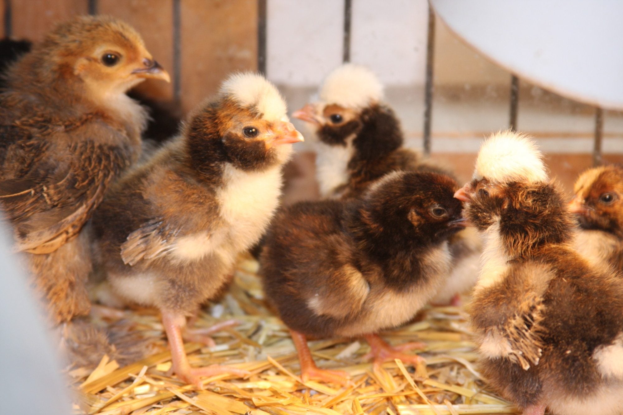 How much you can tell about the coloring in the crest when they are chicks? If the spot on the head is solid white, will the crest be too white? I have a couple that have some darker spots in the white spot on the head... Not sure of what else I should look for to tell what overall quality they may be? Sorry, about all the other breeds in the photos. It was hatching day for others as well. But BOY those tolbunts sure stand out. Thanks for any comments, good, not so good, or otherwise! :-)