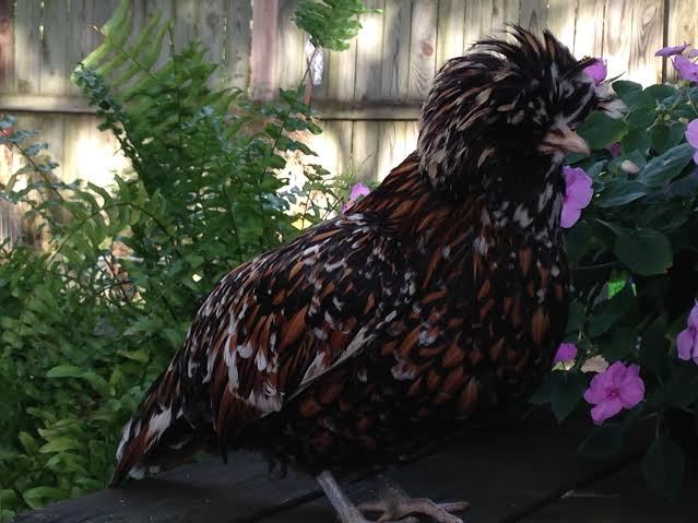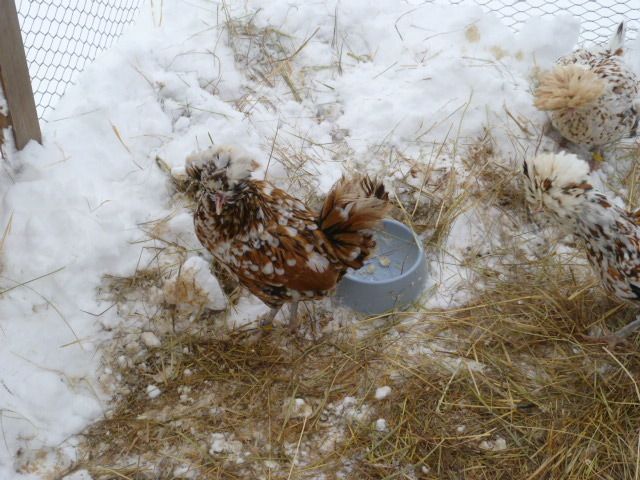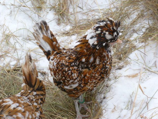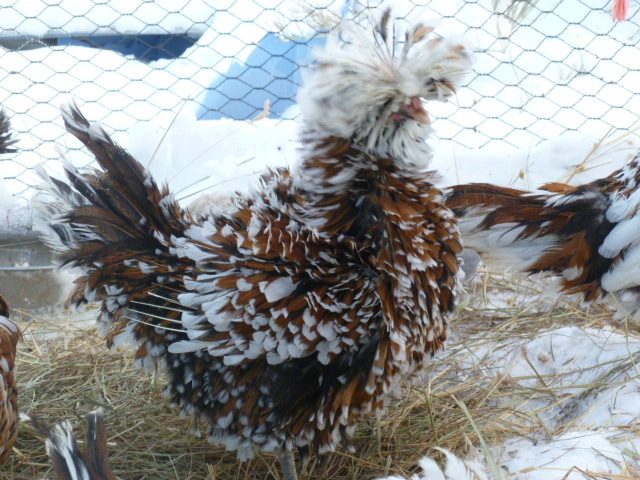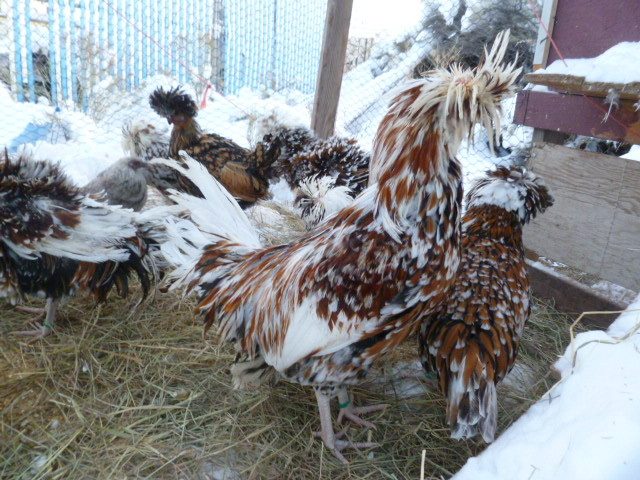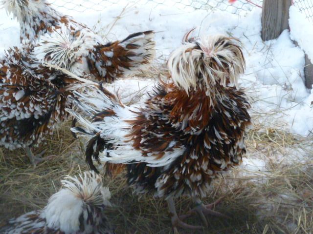 Here are some of my Tolbunts,which include a frizzle cockerel, frizzle pullet and my smooth cockerel with assorted ladies. They are enjoying the hay that I put down so they did not have to stand on the cold snow, but are dealing with the subfreezing temps when these pictures were taken.