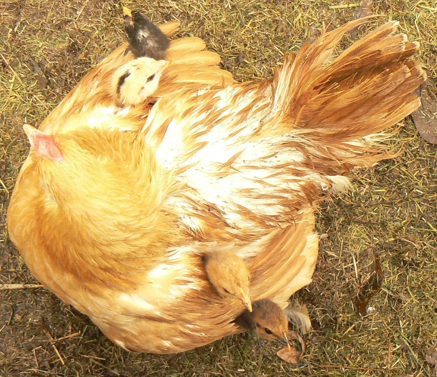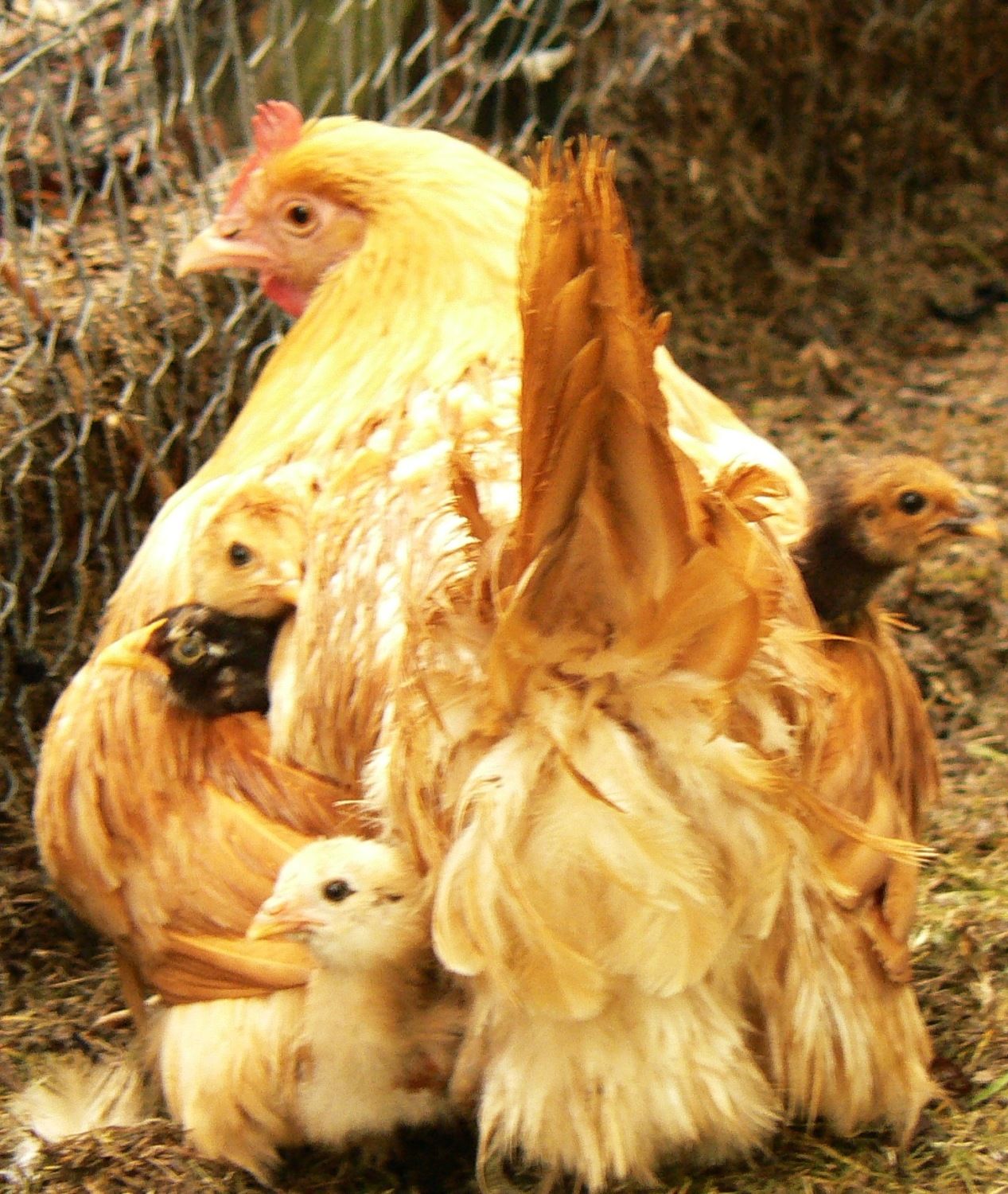 The chicks are -- OK, ready for this -- hens eggs were 2 brown Buff Orpington, 2 green Americauna -- rooster is Barred Rock and Cornish (given to us by our neighbor who had a hatch about 6 months ago and several roosters were born).