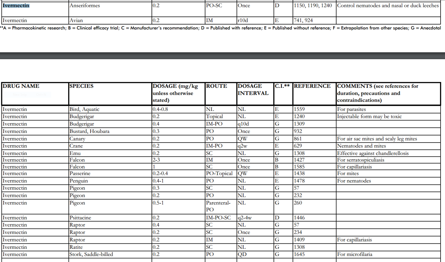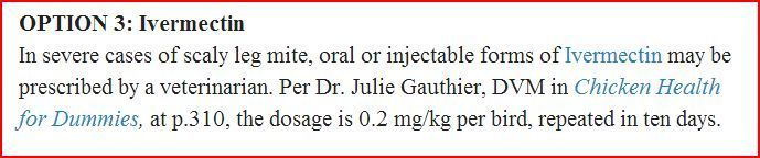 So I thought I would touch one this a little more, and since ivermectin was mentioned, I'll use it as an example.Earlier this year I contacted "Merial" one of the biggest manufactures of Ivermectin in the USA. They informed me that they have "no information on treating poultry with ivermectin". Where are others getting poultry dosage information?