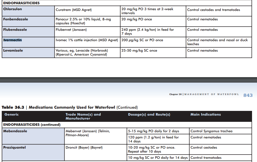 Capillary worms - Source Veterinary Reference Manual. In this picture you will see that it suggests giving ivermectin @ 0.4 mk/kg, but two studies I read suggest that ivemectin isn't very effective at that dose.