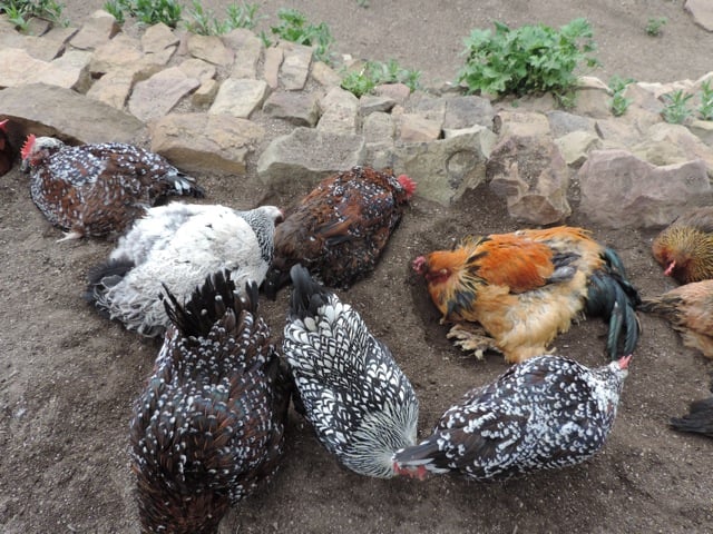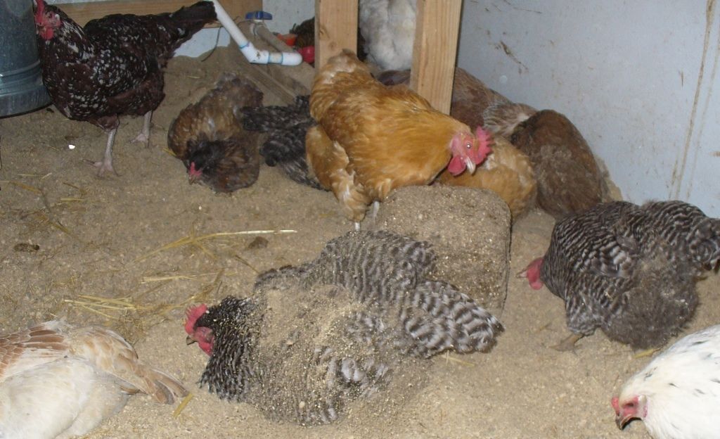 We do not keep confined chickens unless we are not home but I will share what we have done. As you might have gathered from previous Topics of the Week, I have a flock of non egg laying, on vacation, freeloaders so dust bathing and sun baking is their area of expertise