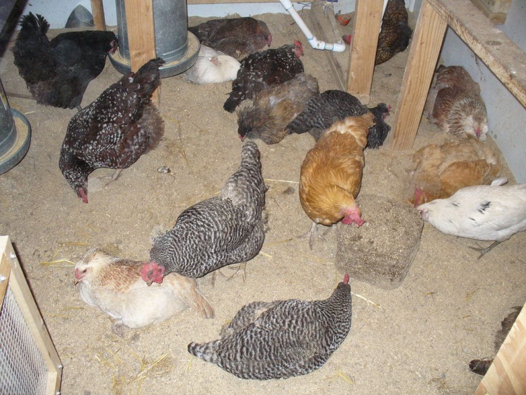 For the adults, I use the same material, the compressed pine pellets as the litter on the coop floor. (the poo from the roosts lands on a table with sweet PDZ, not into the floor litter material)