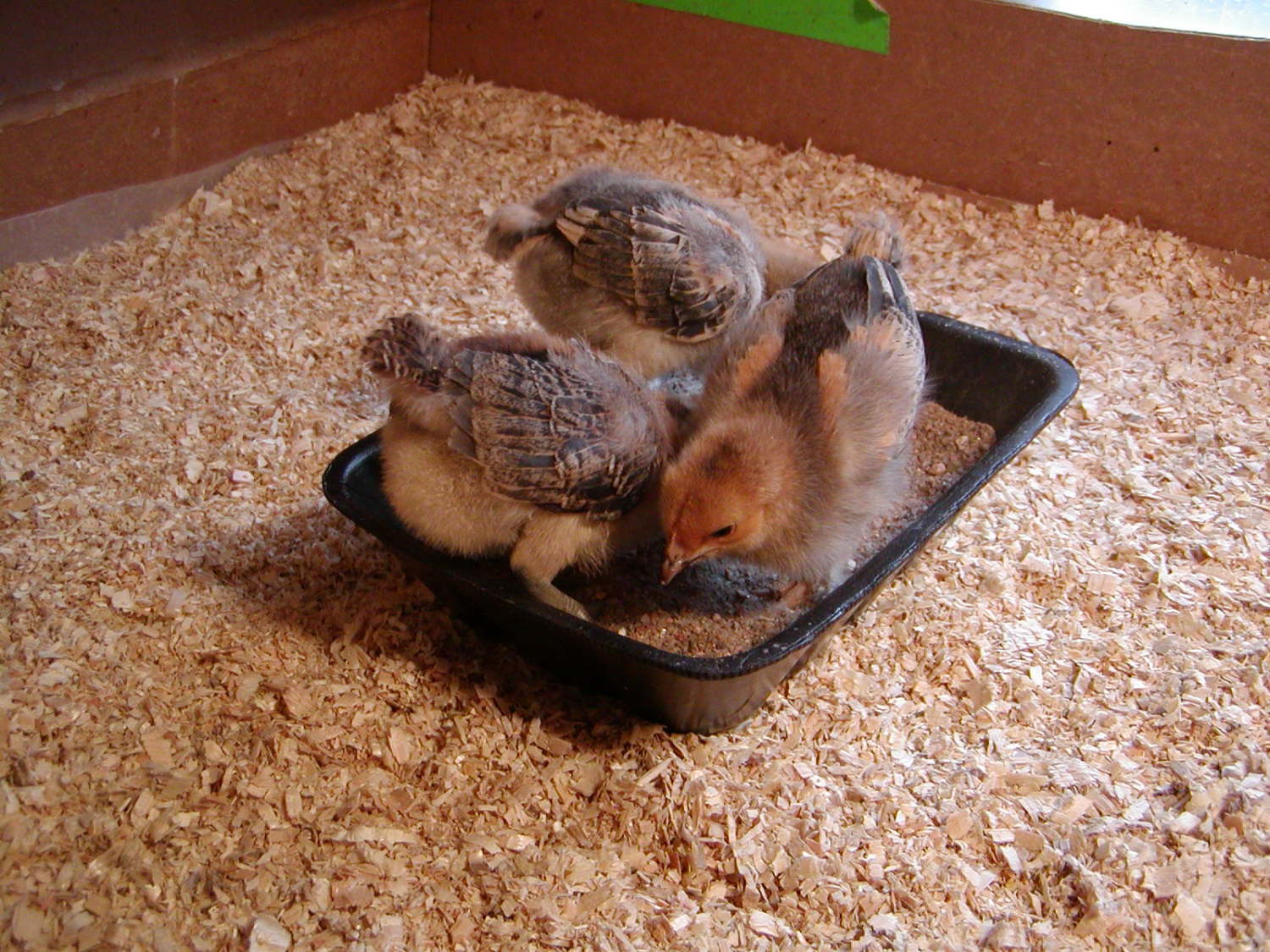 For the first week of chickhood, they're on paper towels with the pellets under the paper towels. That makes it easy to clean, see the poops to monitor health, and they learn what their food is.