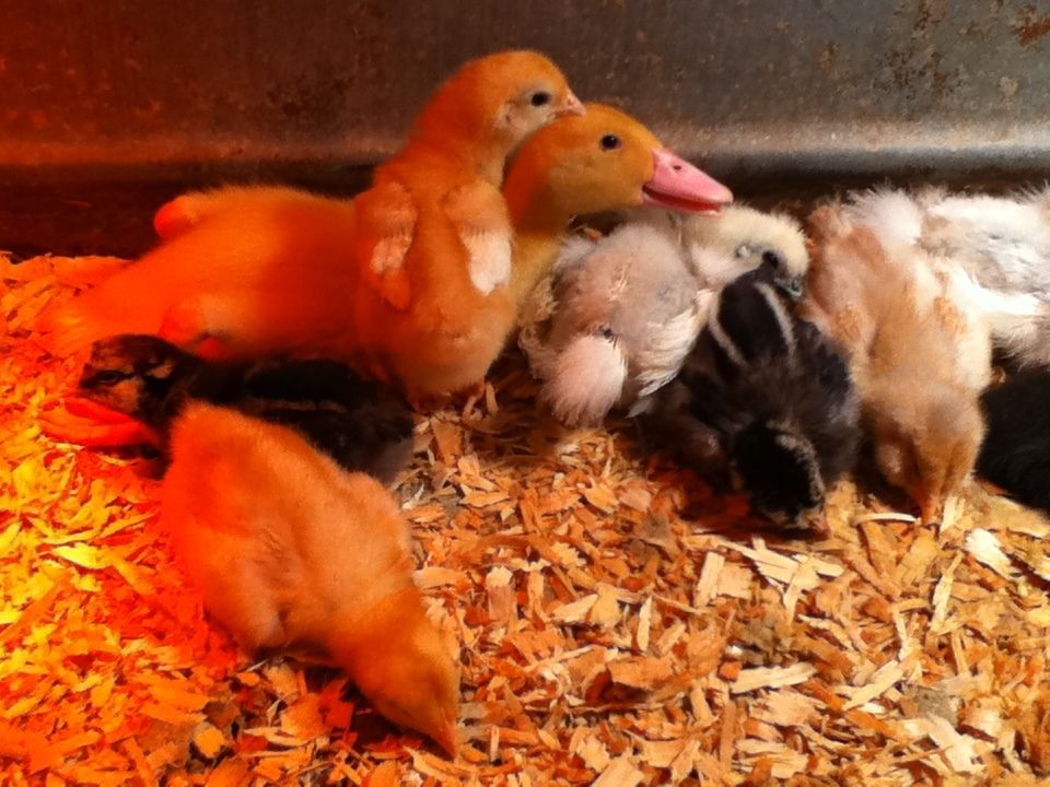 as chicks, I noticed that the ducks got hotter under the heat lamp and would stay out from under it. I eventually moved them to a bigger brooder, keeping the heat lamp on one half and the other side had the food and water which worked out well so both species were happy.