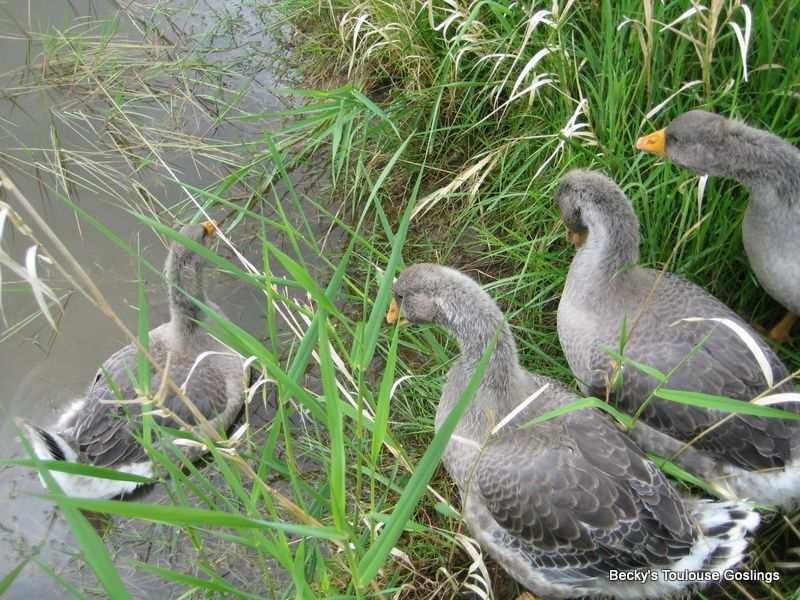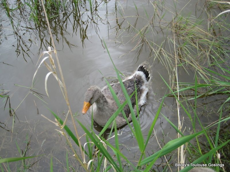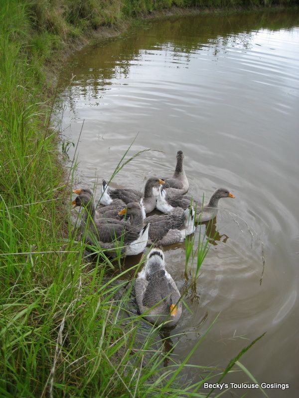 My 'fuzzy heads' are seven weeks old this weekend and got to go for their first outing into the natural pond. I thought they'd go goose wild in there, but stayed really tame and had so much fun pecking into the mud bank! They did stay close to where I was walking. The creek feeding the pond will dry up soon unfortunately, and the pond will be off limits to the geese. That's the plan anyway...