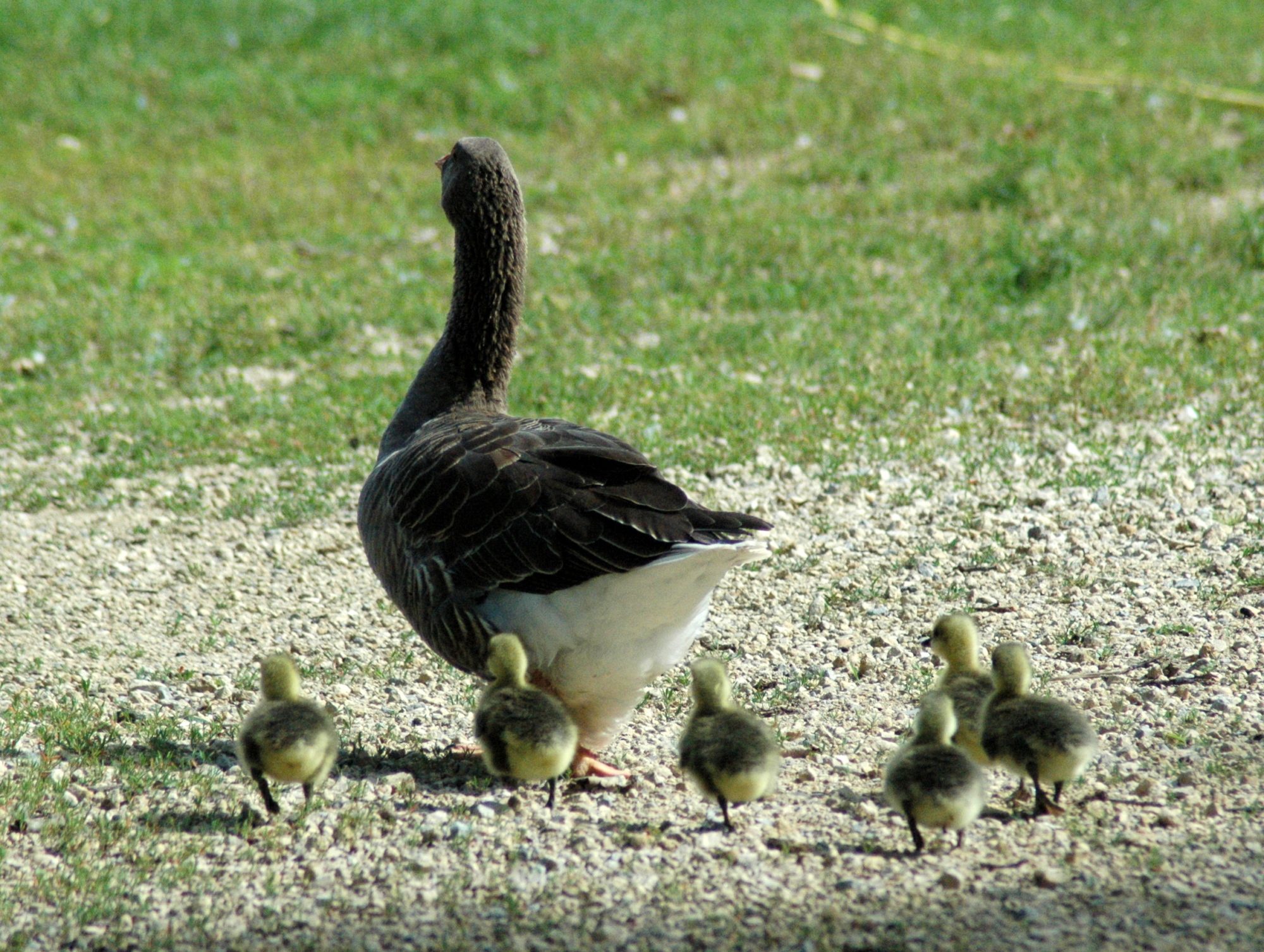 Molly hatched out 6 goslings last week. They are African/Toulouse mix from the shade of their beaks and feet. Molly was to be Buddy's mate, our only other Toulouse, but he does not like her. However, Ginger does like her. She laid 11 eggs, hatched out 6. Sometime last Saturday, she lost one...probably to a hawk. The remaining 5 are growing like weeds and learning to get along with the rest of the flock.