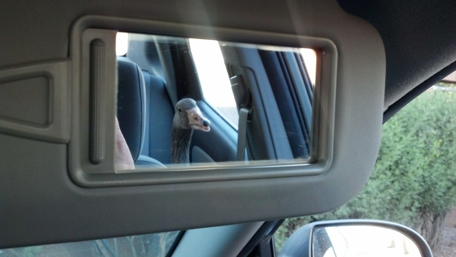 She was really interested in what was in HER crate and kept trying to crawl back there, so I put her in the back seat and after a few minutes she started pecking at my shoulder over the seat vying for attention lol I watched her through that mirror for a bit but she's too clumsy to stand and look out the window So back up to the front where she could sit in my lap at just the right height to see outside. Dorky goose!KuKu, that last pic of Trina in the mirror is cracking me up! And Pom Pom is beautiful... congratulations!