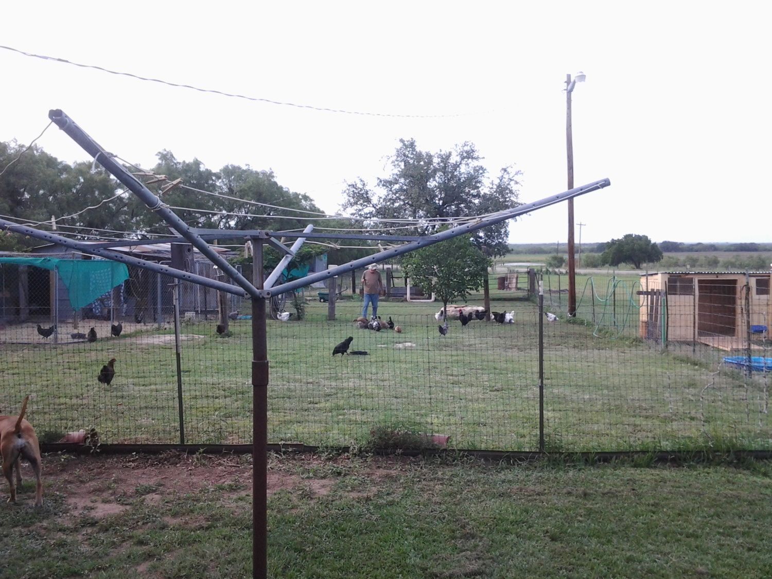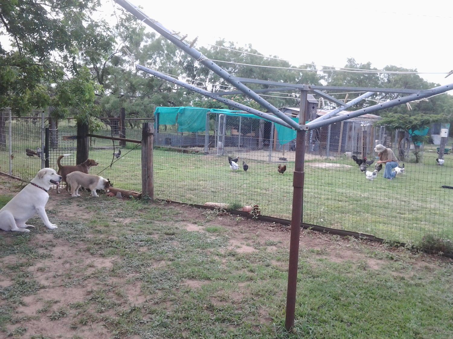 The second picture (below) is oriented a little more to the left and show the field behind the chicken/duck pens which is about 125 acres of Mesquite thicket with Black Angus running on it. They all just calved and they come right up to the fence to try to figure out what these noisy feathered things are. You can also see three of our dogs, the Anatolian, the Sheltie and the Short Haired Pointer. Duke, the Anatolian, does the protecting, Red, the Short Haired Pointer, wants to track and hunt them and Bela, the Sheltie, wants to herd everyone and keep everything in order. Everyone spends a good deal of their time at the fence very frustrated.