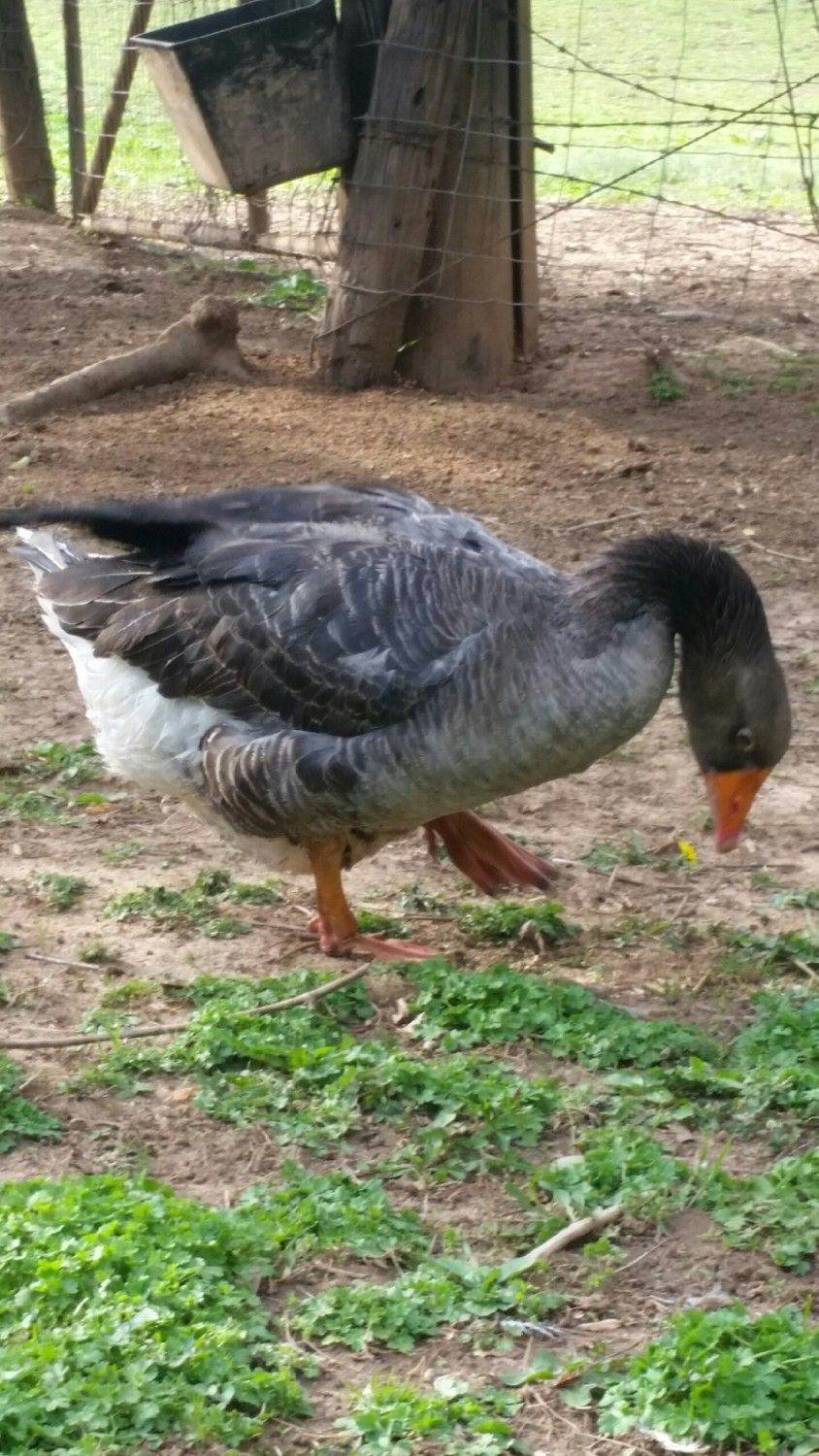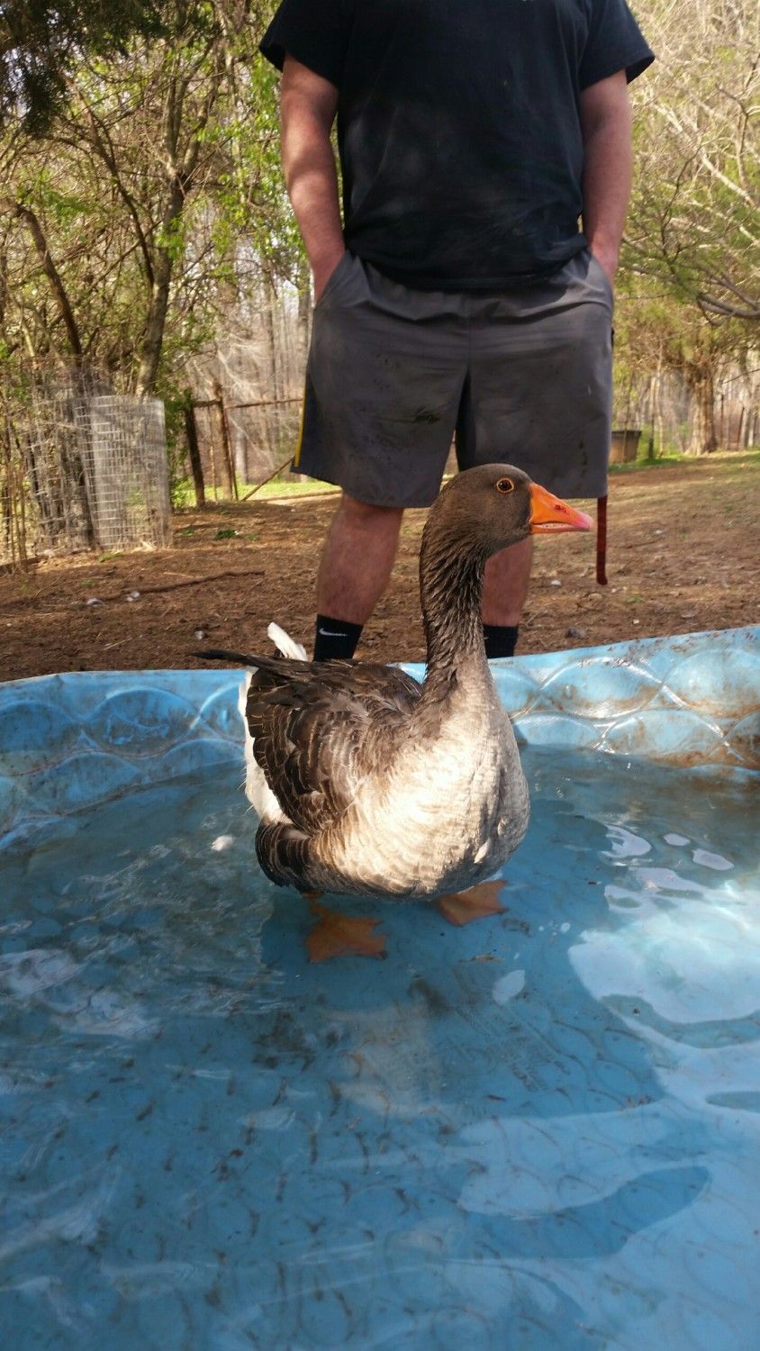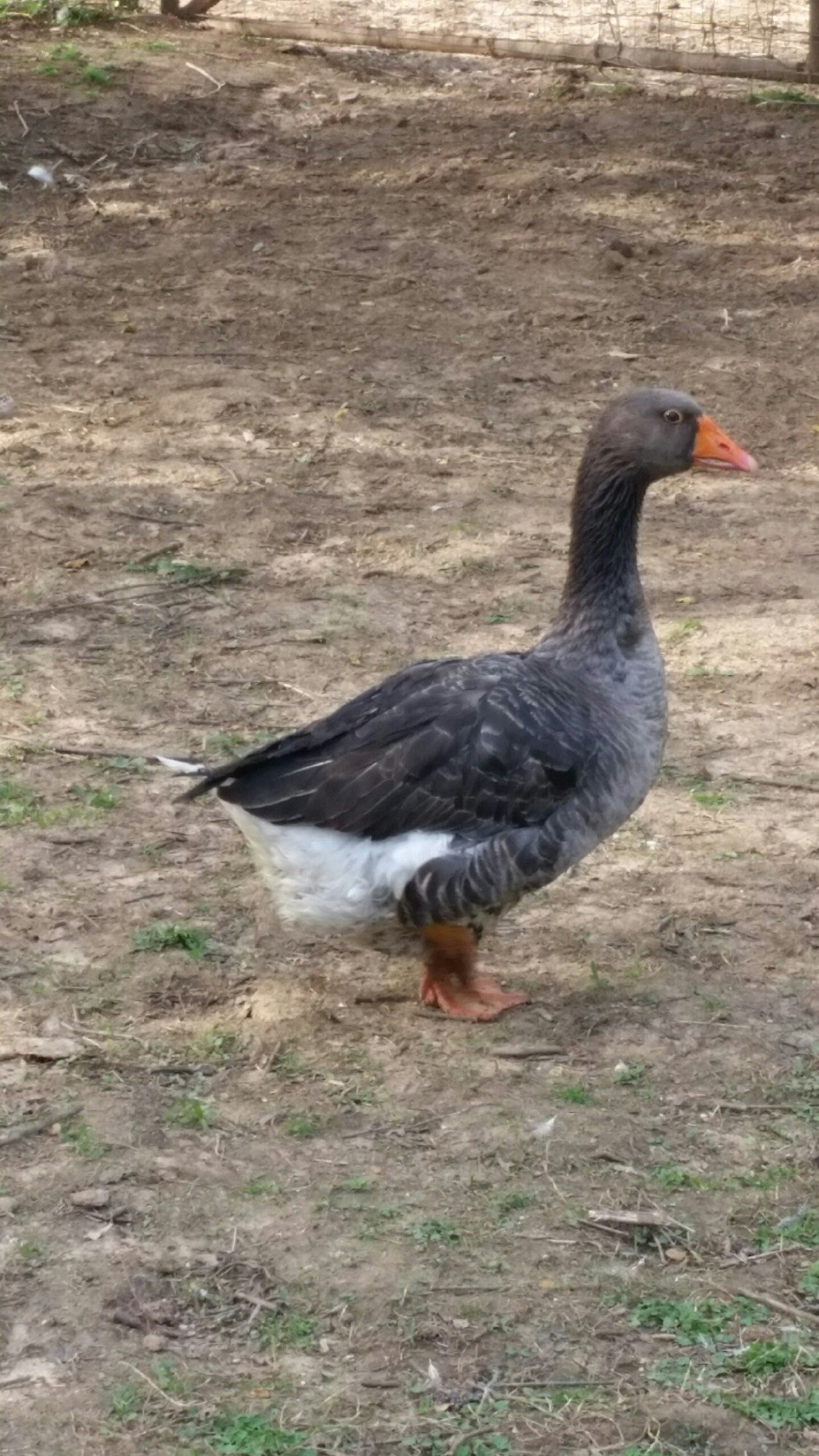 Hello there! My name is Angela and yesterday we rescued a female goose from a busy road. Her mate had been killed by a vehicle and she was not going to last very long. We don't know how old she is. She did have a nest nearby with 4 eggs in it and we also brought her eggs along with her. Her feathers appear to be in poor shape and she has a thin area of skin hanging down between her legs. The little bit of information we were able to get from some nearby folks was that they were strays who had arrived in the area and had been just living on whatever they could find to eat - chicken food, dog food, etc. I settled her in our chicken coop last night and she did fine. She is staying right around our house, thank goodness. Fortunately, we are a mile off of any roads on 50 acres. Our chickens and guinea hens free range (up at night) and we have 2 LGDs who guard them. My question for those of you with Toulouse experience are as follows.... Is that thin skin hanging down between her legs normal? Her feathers appear very rough and are breaking, what should we feed her to help her condition improve? Anything else I should do for her to make her comfortable? I am currently incubating 3 Chinese goose eggs so eventually, she will have some friends. She seems to be sleeping with 1 of our LGDs and our cat which seems odd, but we don't mind. I have no idea what to do with the 4 eggs we brought with her. I don't know how to make a "goose nest box". Thanks so much for any helpful info!!