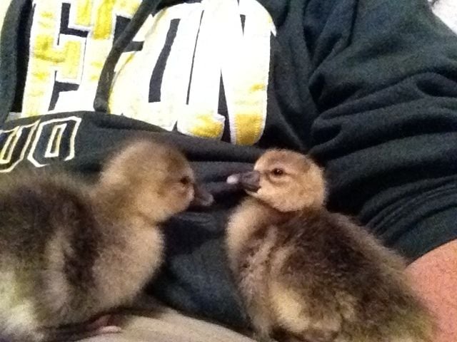 Day old dewlap toulouse goslings sitting on my lap. Eggs given to me by a friend