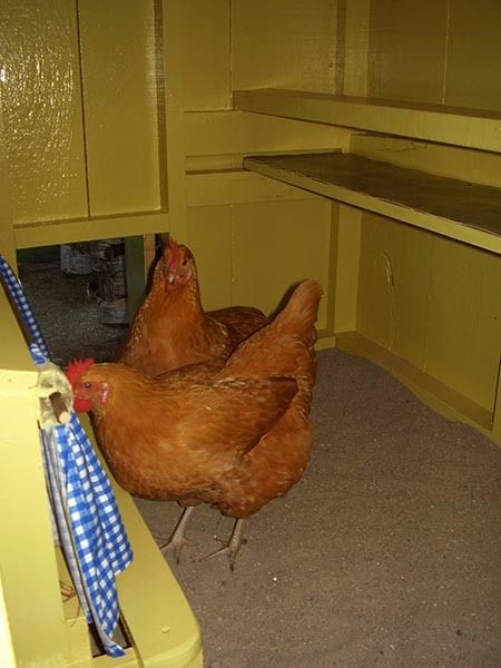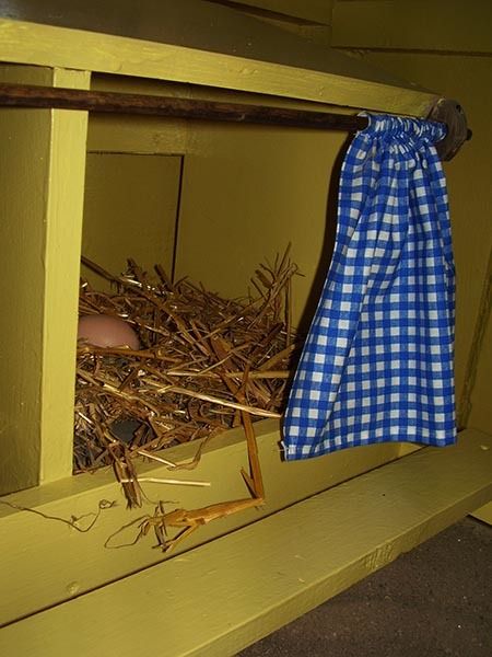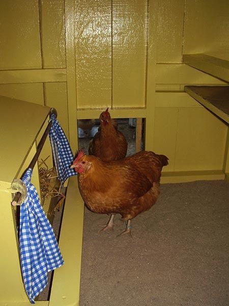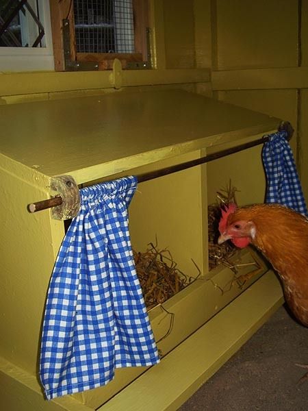 We have 2 nesting boxes. I made the cute blue gingham nest box curtains...