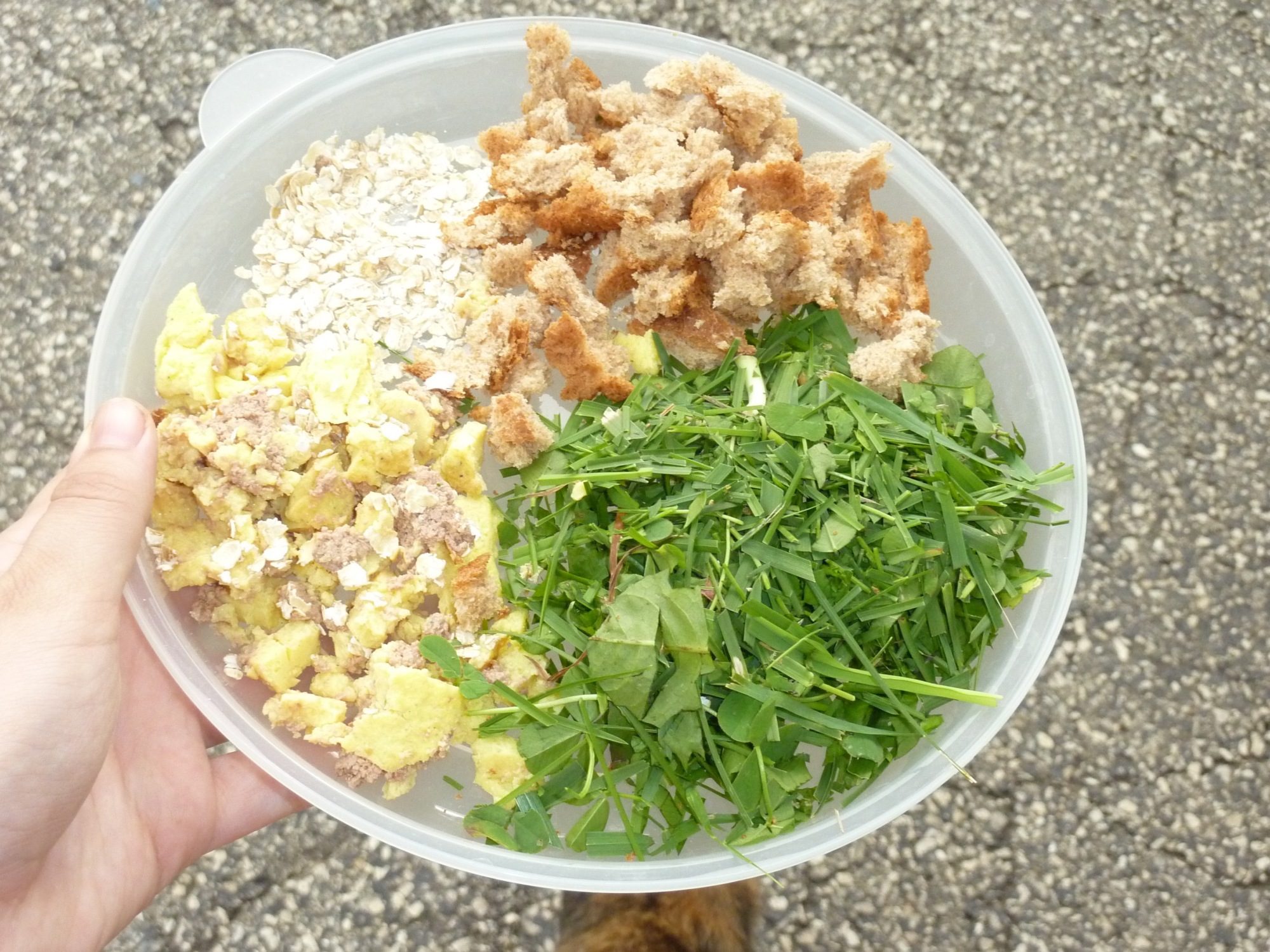 I leave a dish of chopped up grass/clover/dandelion, wheat bread pieces, scrambled eggs, and dry oatmeal on a plate. My chickens adore eggs and bread so these I use to tame them as well.