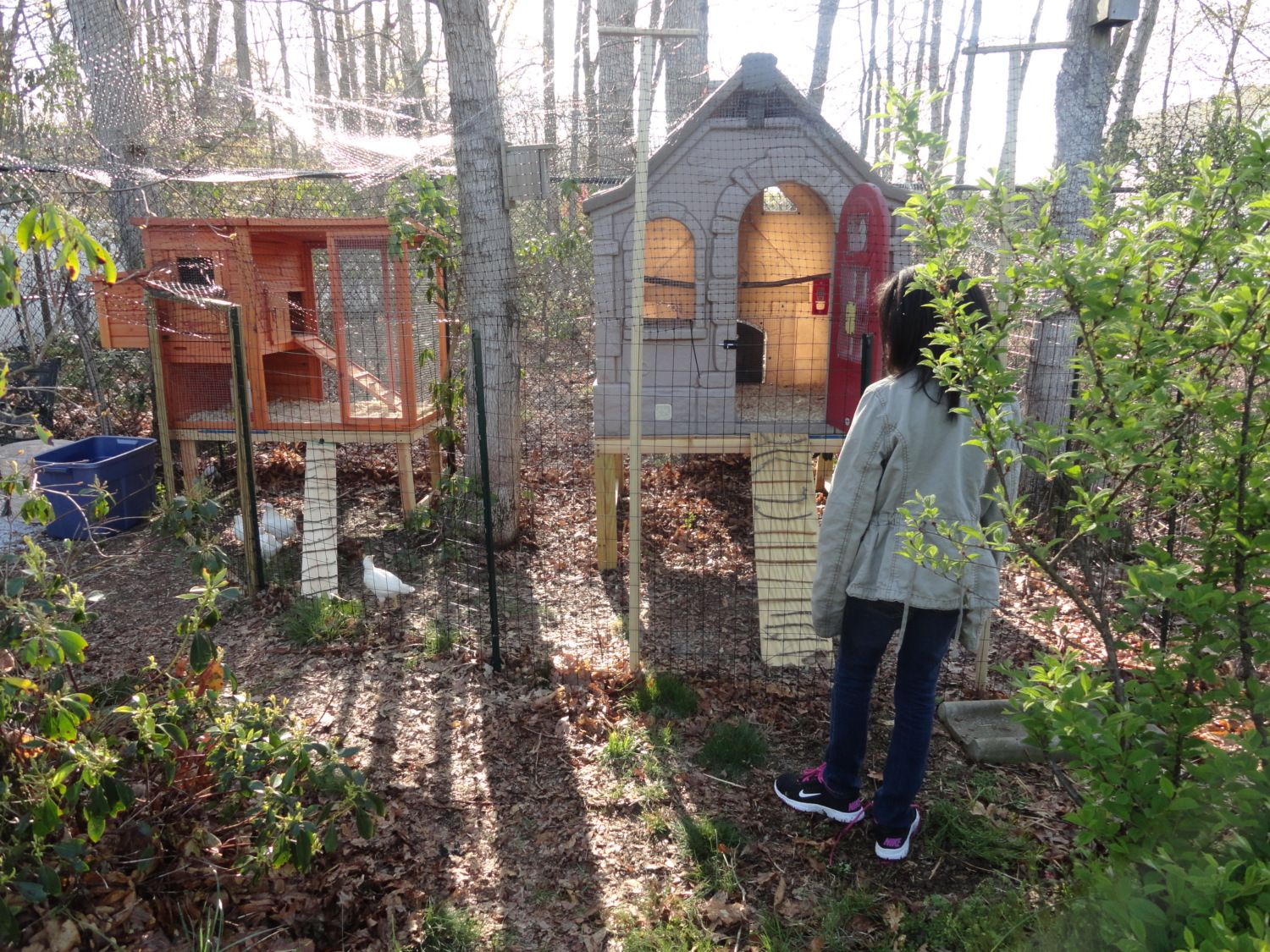I have been on a mission to get this area ready for the 6 chicks. Yesterday, Saturday, April 27, was their first time outside. They have two coops and two runs. One area has their coops and a run which opens up to the larger run. I netted the whole area.