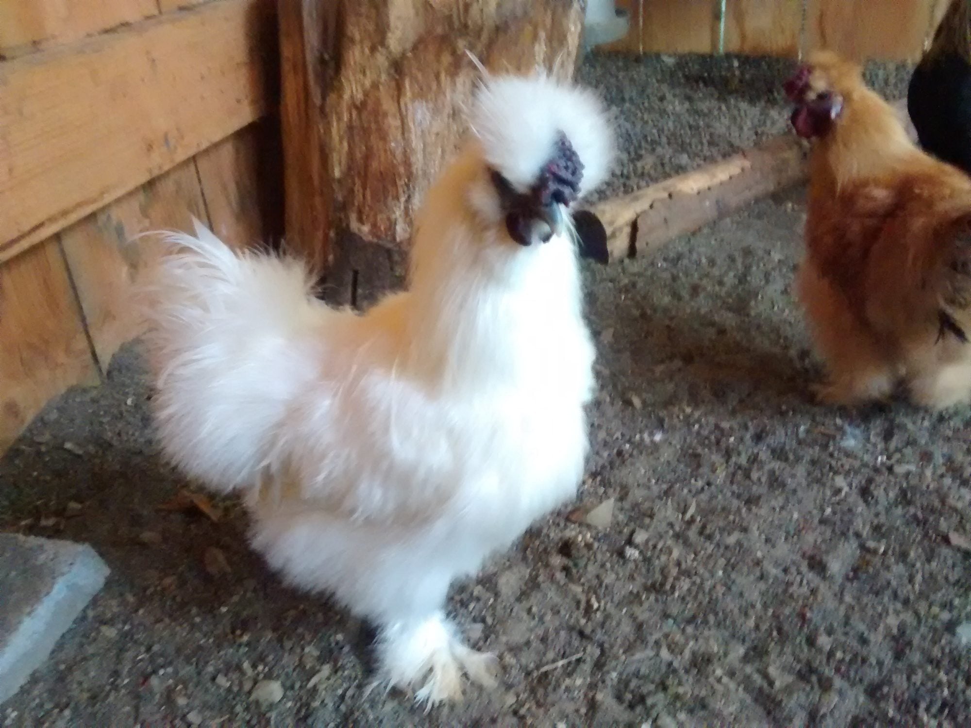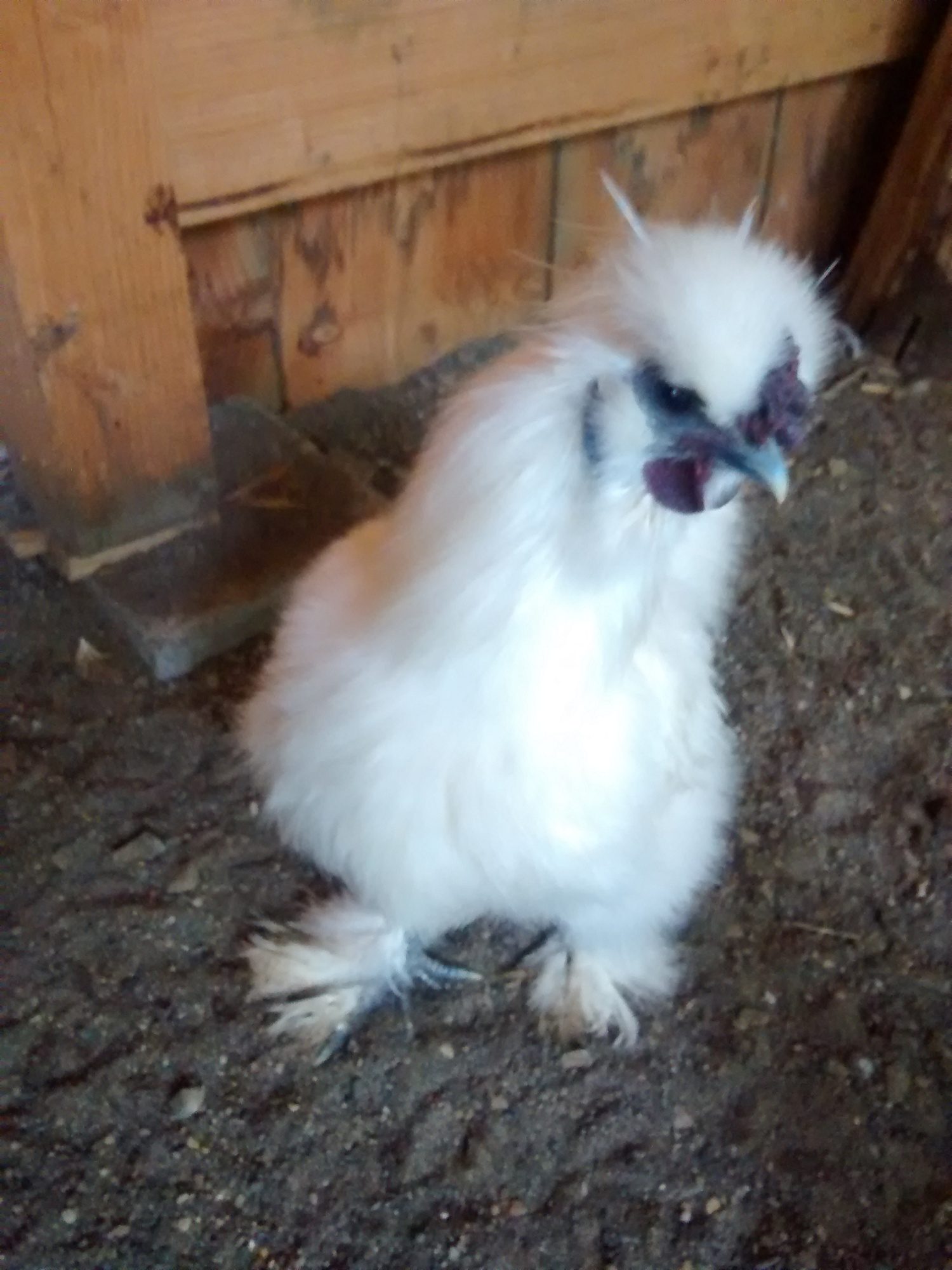Early this spring, I went to my local feed store to get some chicks. I wasn't planning on getting silkies, but there they were. I told myself I was just looking...we all know how that goes! I soon decided to get just three. While I was visiting with them, one little white chick kept racing over to me and jumping into my hand- over and over, chattering away at me. I was pretty sure he was a rooster even then- he had that air about him. I already had a white silkie pair at home, but he was so determined I couldn't resist, and he came home with me, along with three other silkie chicks.