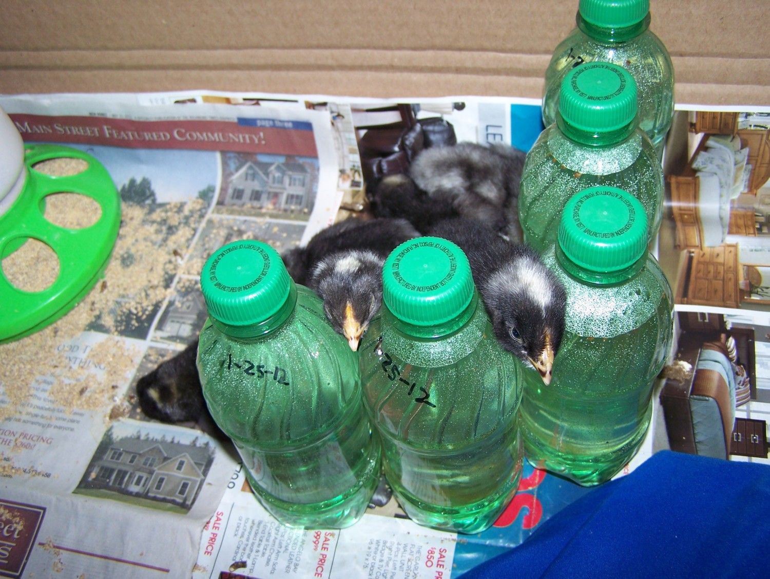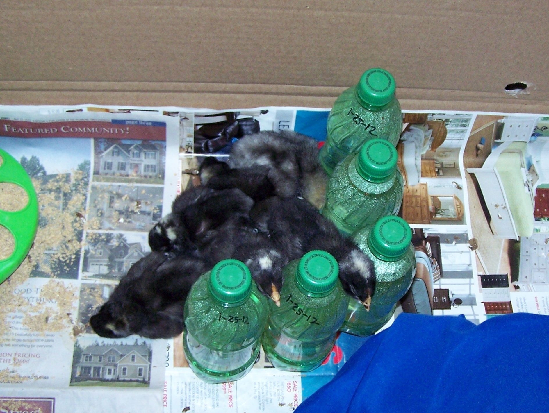 Snow started last night around 9 here in Goochland County, Virginia. Woke up this morning to 6 inches and wind. It's that wet heavy snow, so we lost trees and our power line. Haven't had electric since 10 a.m. We have a wood stove, and I moved the 6 babies in their brooder to right beside the stove, but it never got past 80 degrees inside the brooder. So I had some little soda bottles I had water stored in. I emptied them in an iron pot and put it on the wood stove to heat up the water, then once hot enough poured the water back in the bottles. I then made a semi-circle of hot water filled bottles around the babies to give them some heat. It worked! Kept them warm until Hubby could set up a spot outside for the generator. They now have their heat lamp back! We ended up getting 11 inches, and power isn't expected to be restored until Friday