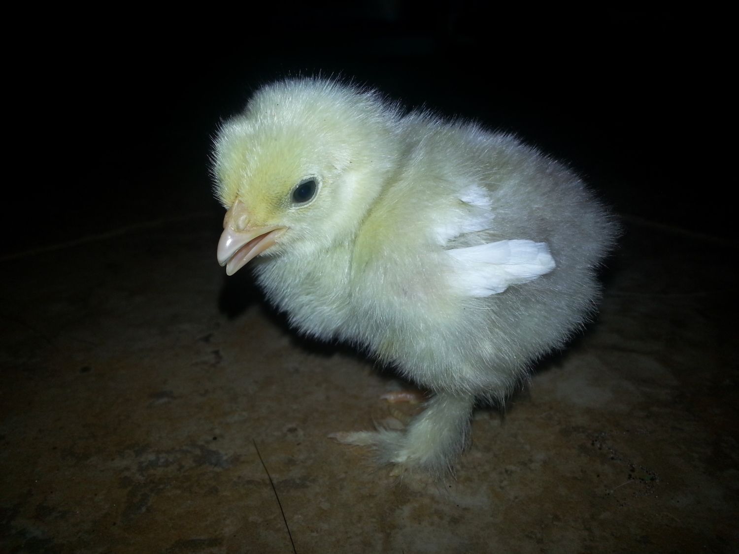 this one is tiny and solid yellow with white feathers coming in on wings and tail