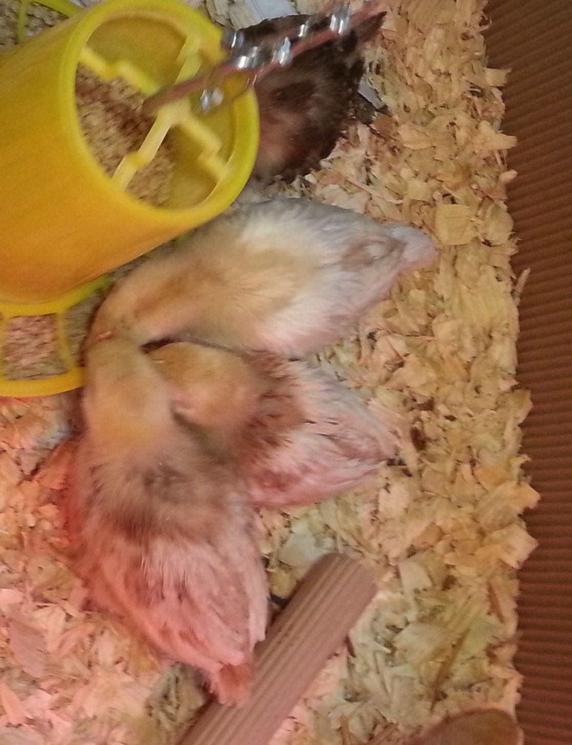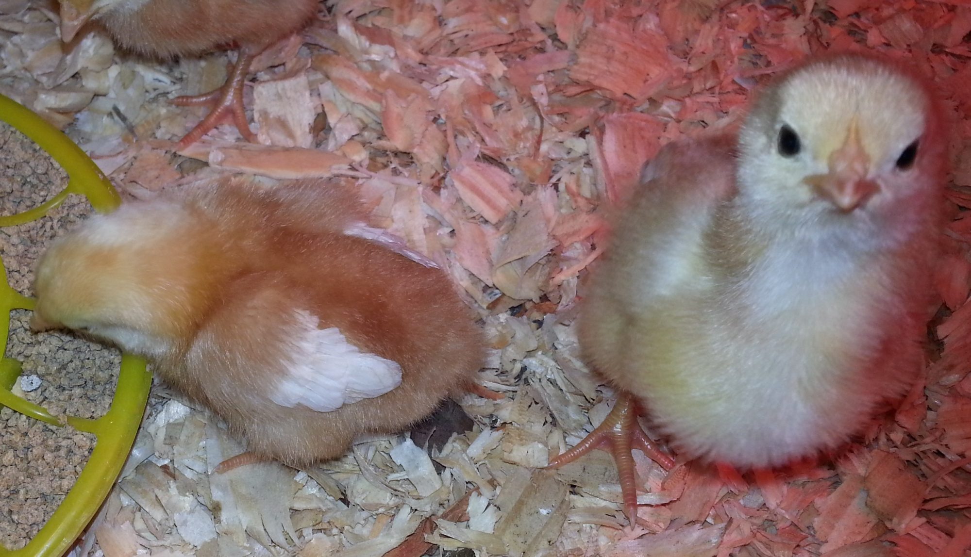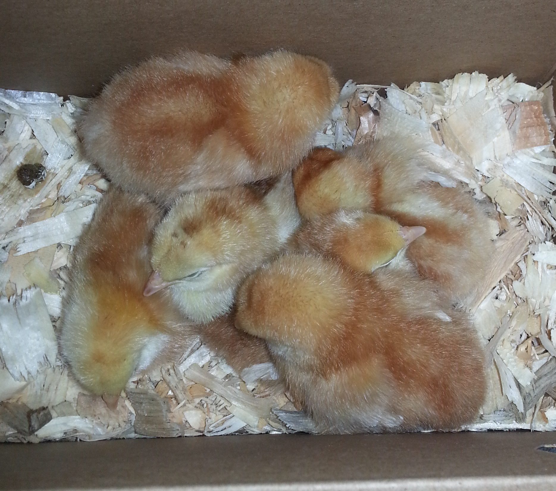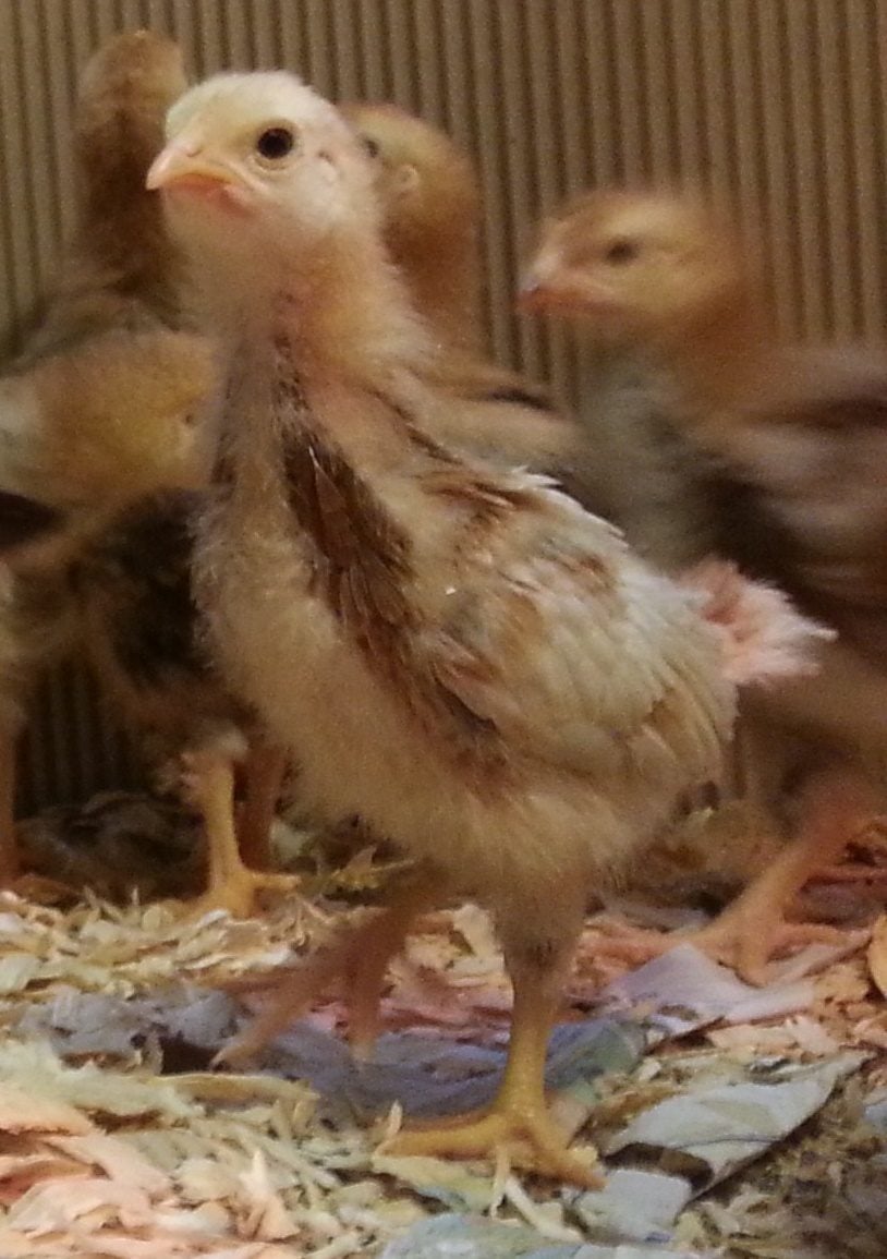 I picked up twelve babies at TSC two weeks ago (these six from one store and six RIR's from another). The first six were not labelled other than pullets. I have included pictures at just a few days old and now at 2 weeks. Everyone has been active and healthy minus a little pasty butt one day last week.