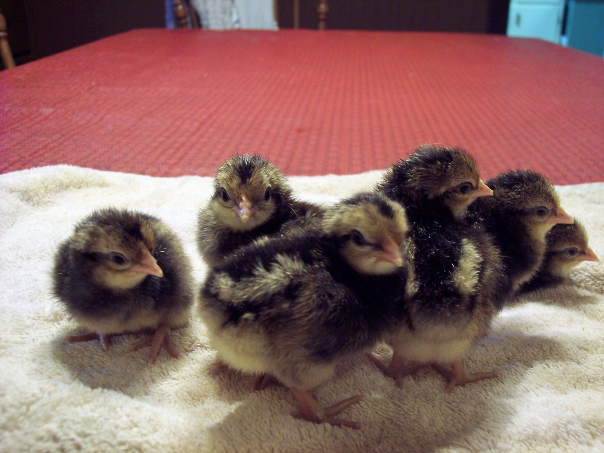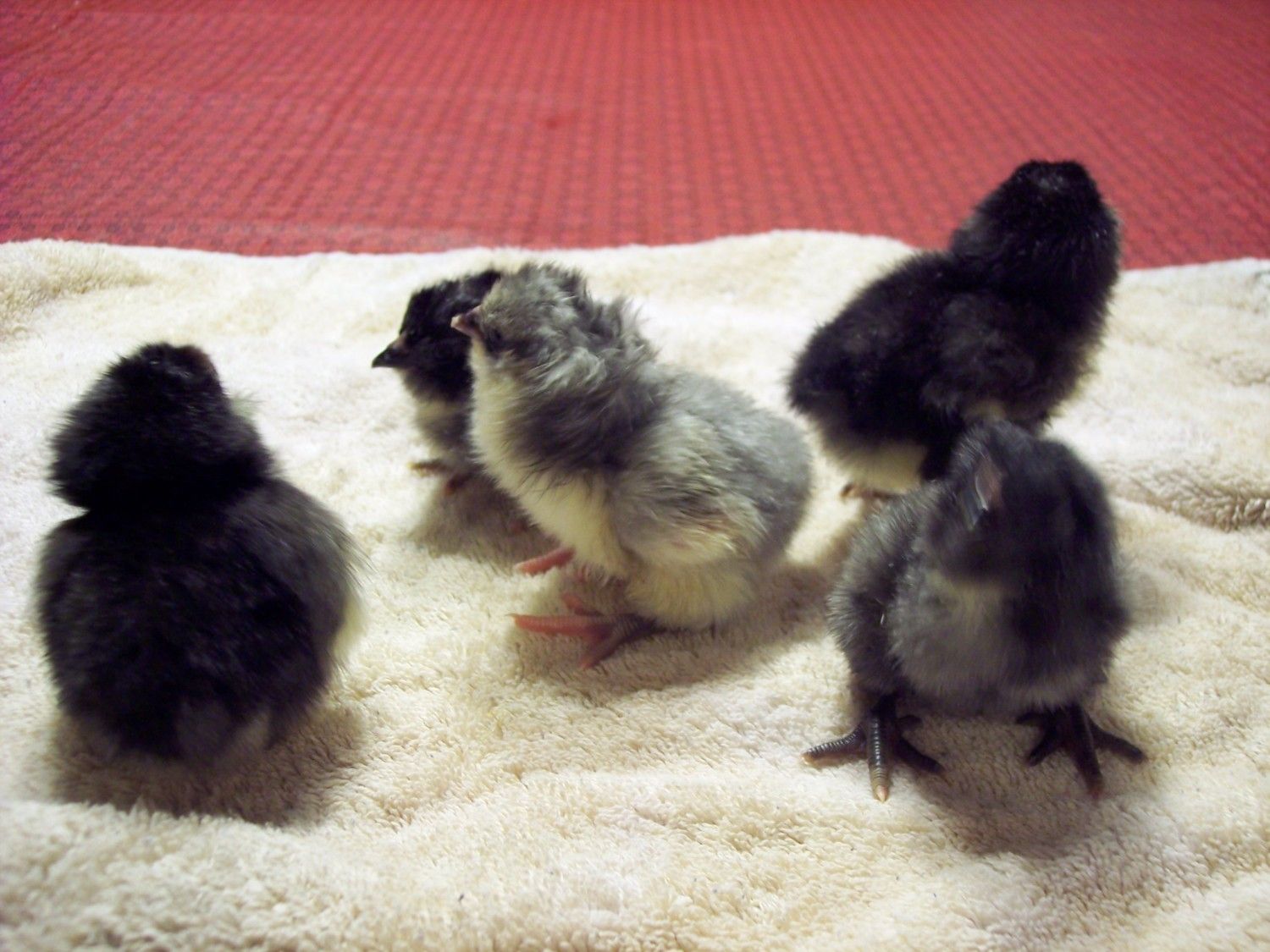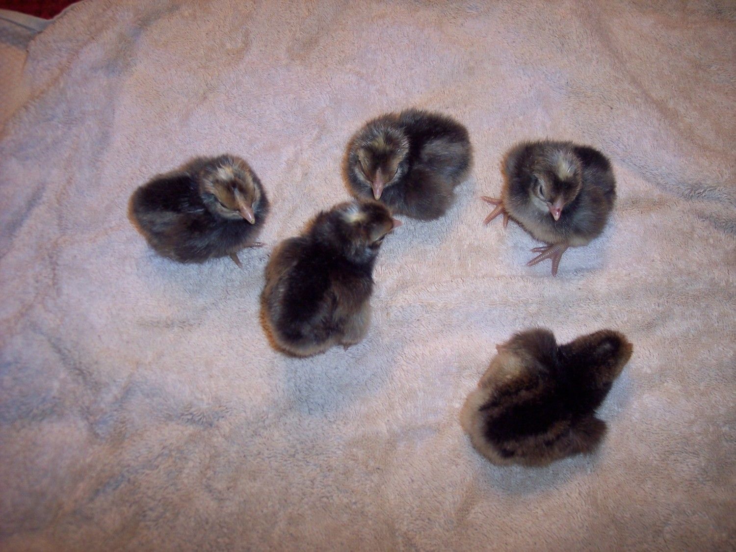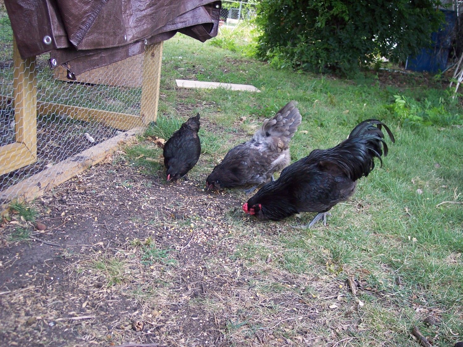 Here's a picture of the parents, The roo is black, one hen is black, one hen is blue. The blue hen was already overbred when we got her, I'm guessing the feathers won't grow back until her next molt. She will be very pretty then, but not so pretty now!Definitely interested in your hatchlings. Post pics when they arrive! How long before you are ready to release them? What kind of honey? Wildflower?