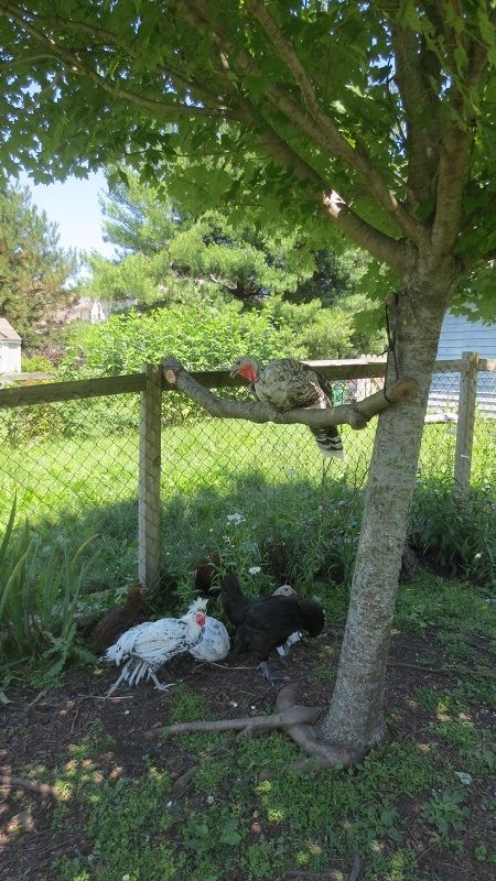 The saw horses are a favorite roosting place of all the chickens and turkeys. Sometimes they nap there, but a lot of the time it's their front row seat for watching us through the window. I do think the branch is an improvement, since the old plank is rotting, plus it's narrow side up.