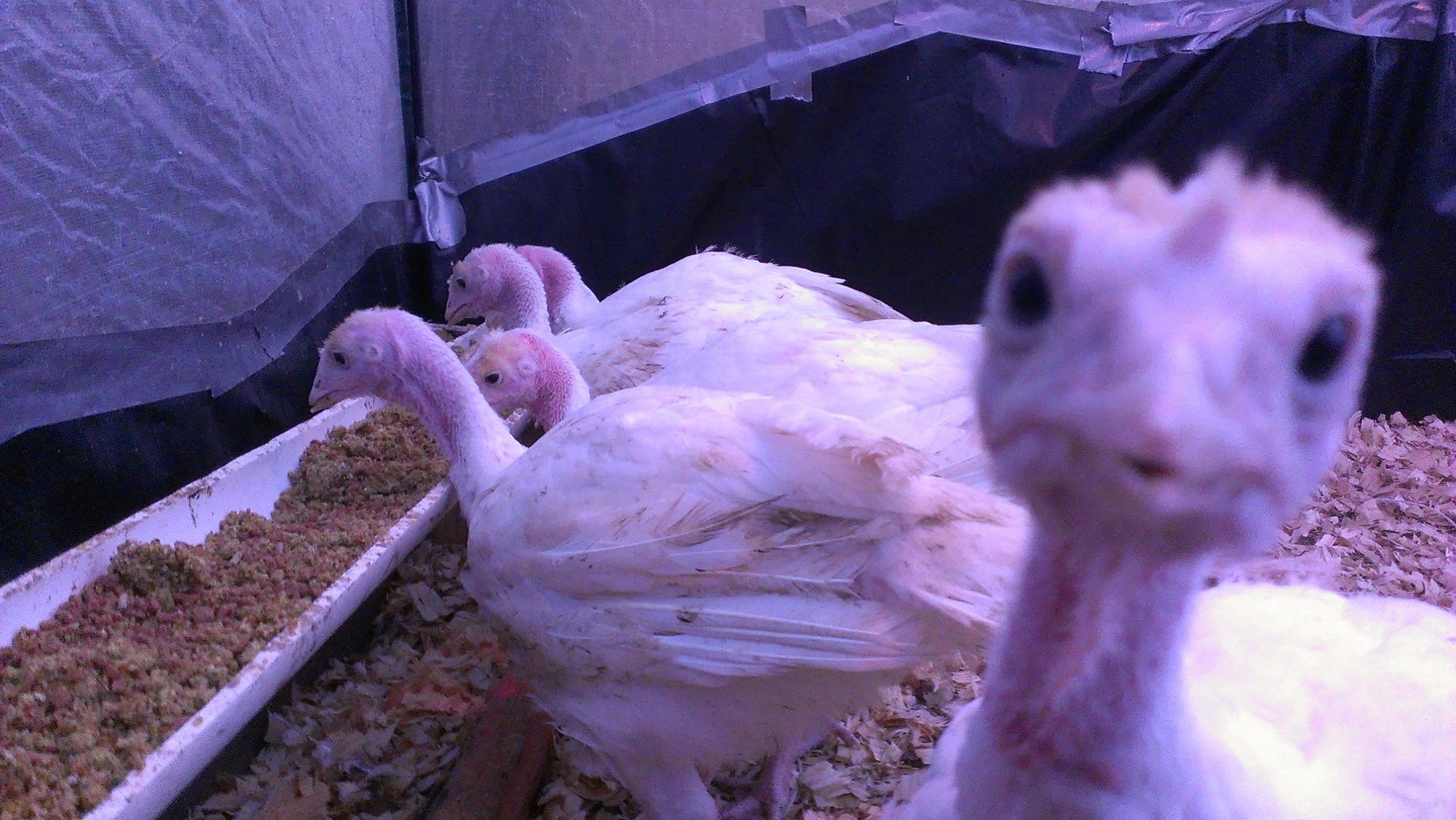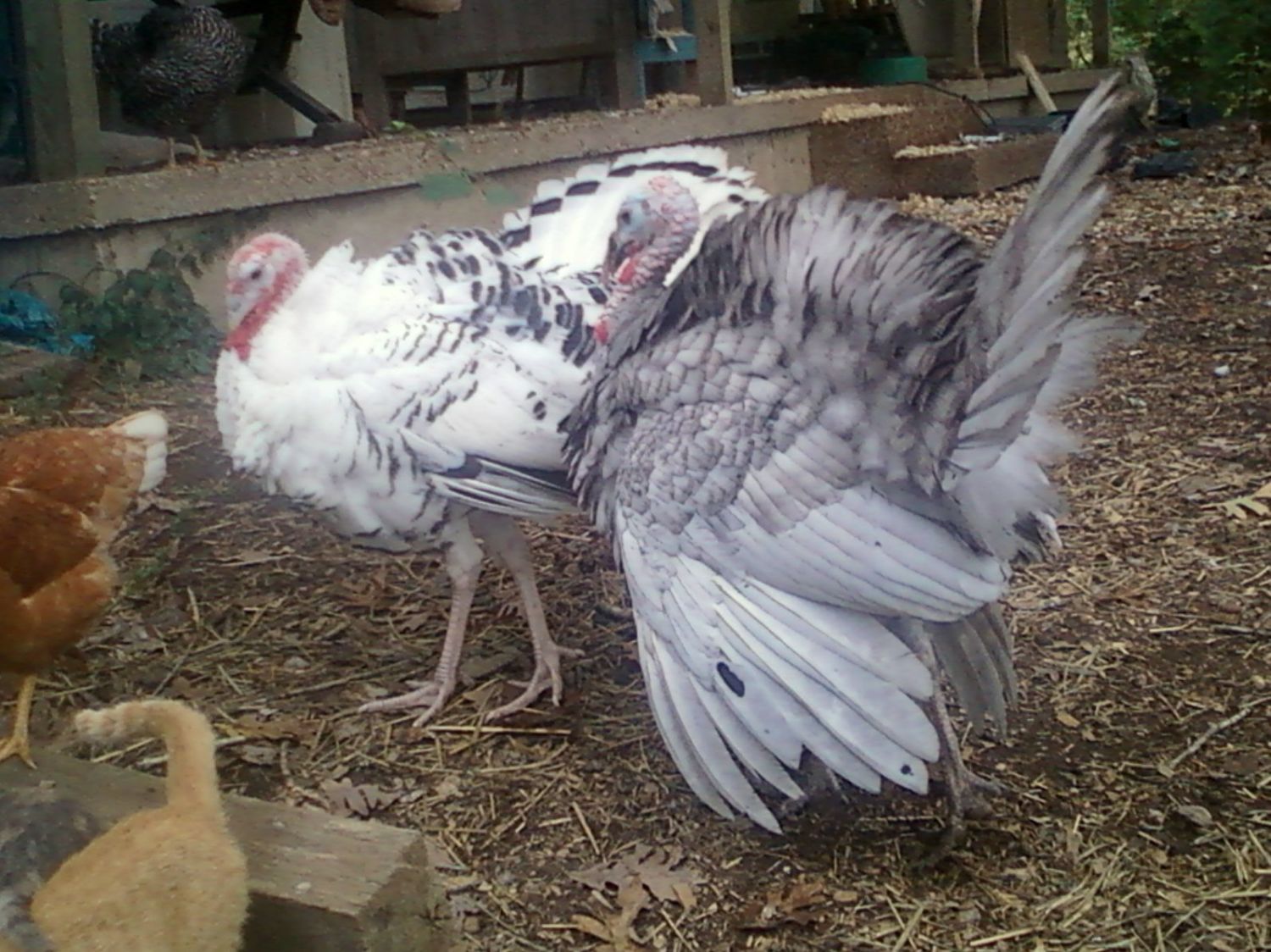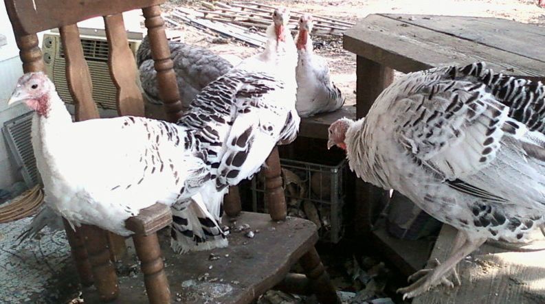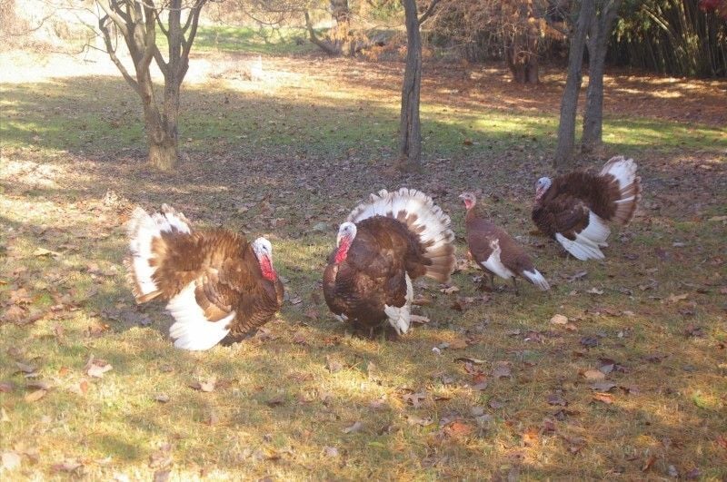 Wow, Very nice turkeys, and friends ! And what a variety! When you do eat them, please let us know which ones you think taste best? I see you have guineas, If you plan to sell eggs next spring, please let me know, I would like some eggs for hatching. I hear they make great noisy watch dogs. I have Rouen and Pekin ducks, African brown geese and Holland turkeys and a lot of chickens so if you want to swap Guinea eggs for any of these, please let me know.Not one to do things half way......I started with turkeys this year and had wanted to start with just the narragansett but at the time they were out. So I picked up a few blue slate (that looking at that site provided look more like lilacs) and royal palms. Then a month or so later the nars were available so I picked up 4 of those as well - and another blue slate (lil bit so shes younger and smaller and having difficulty competing with the older, larger birds).