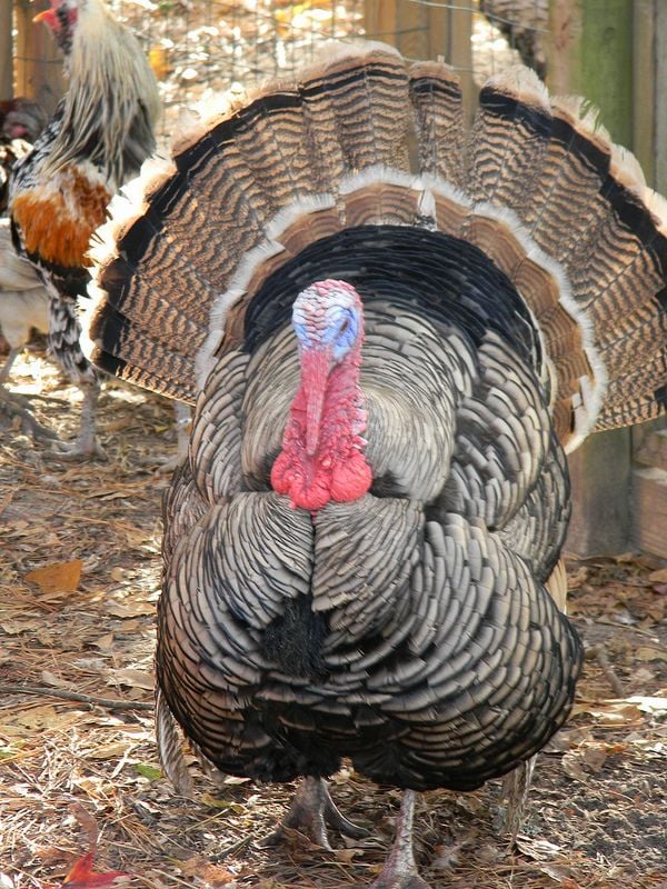 Oops! I forgot my first turkey was a giant bronze. He was given to me all ready grown. All I can say is he got VERY agressive to the point I had to carry a broom out with me. He never spurred anybody but drew blood pecking more than once. A stray got him or he would have hit the table......HUGE tho.