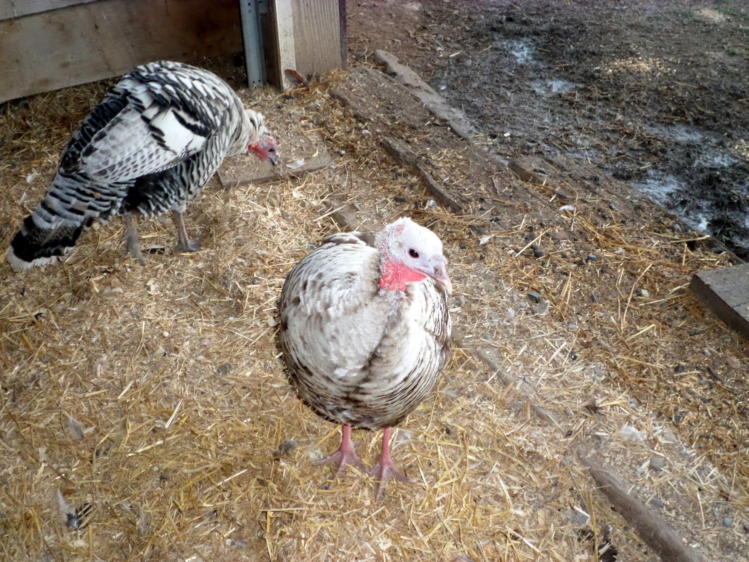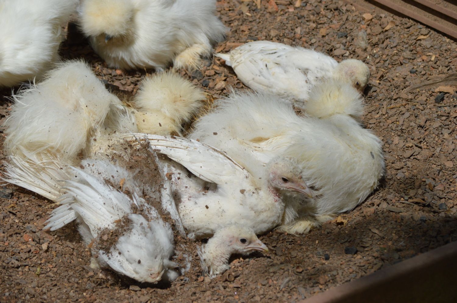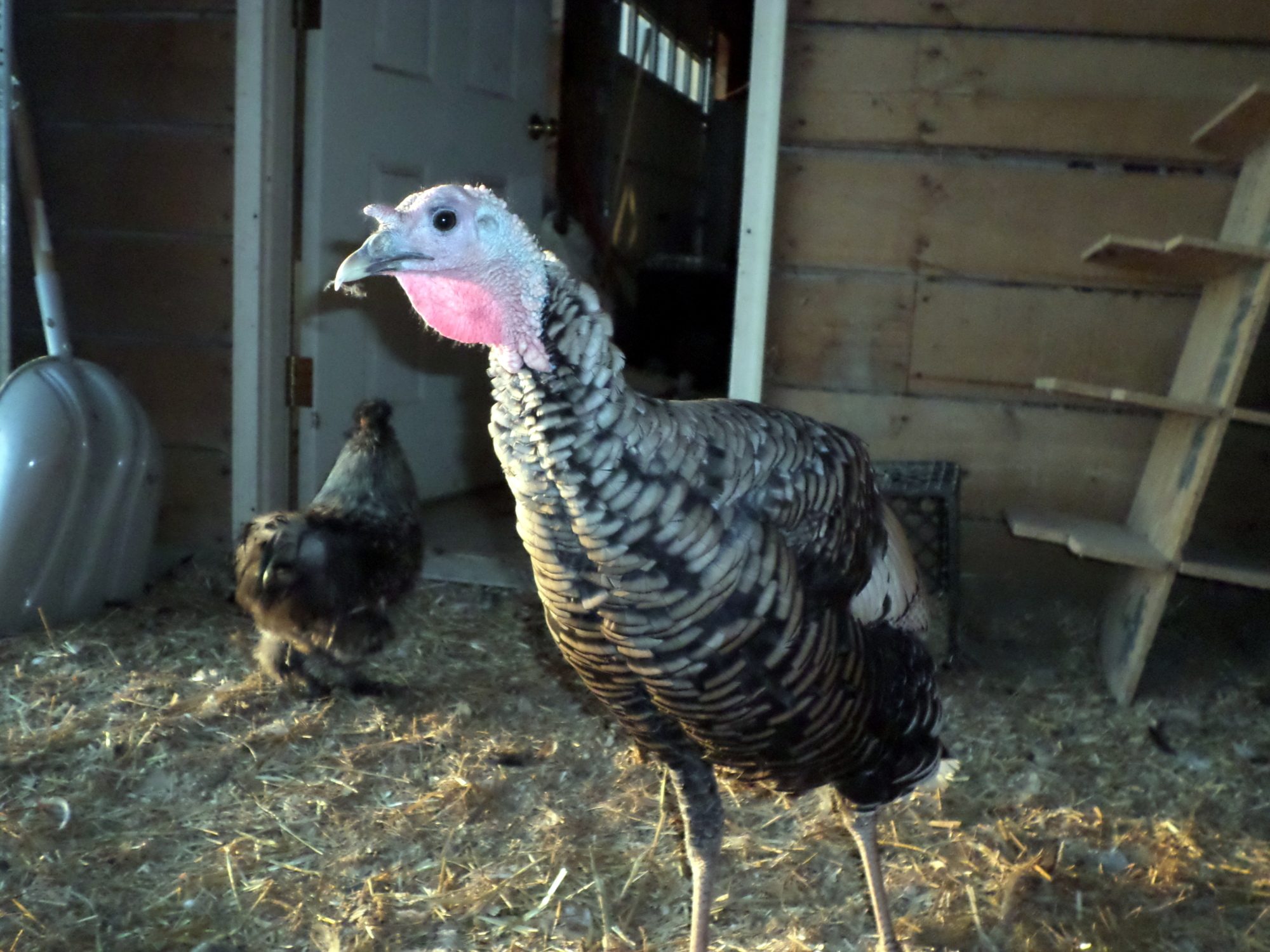 This girl just cracks me up because I never know what to expect to find with her. She is brooding a silkie mix hen. The chicken hen would steal her eggs and so I think she gave up and decided to brood her too! LOL Look to the bottom left of the turkey hen. LOL