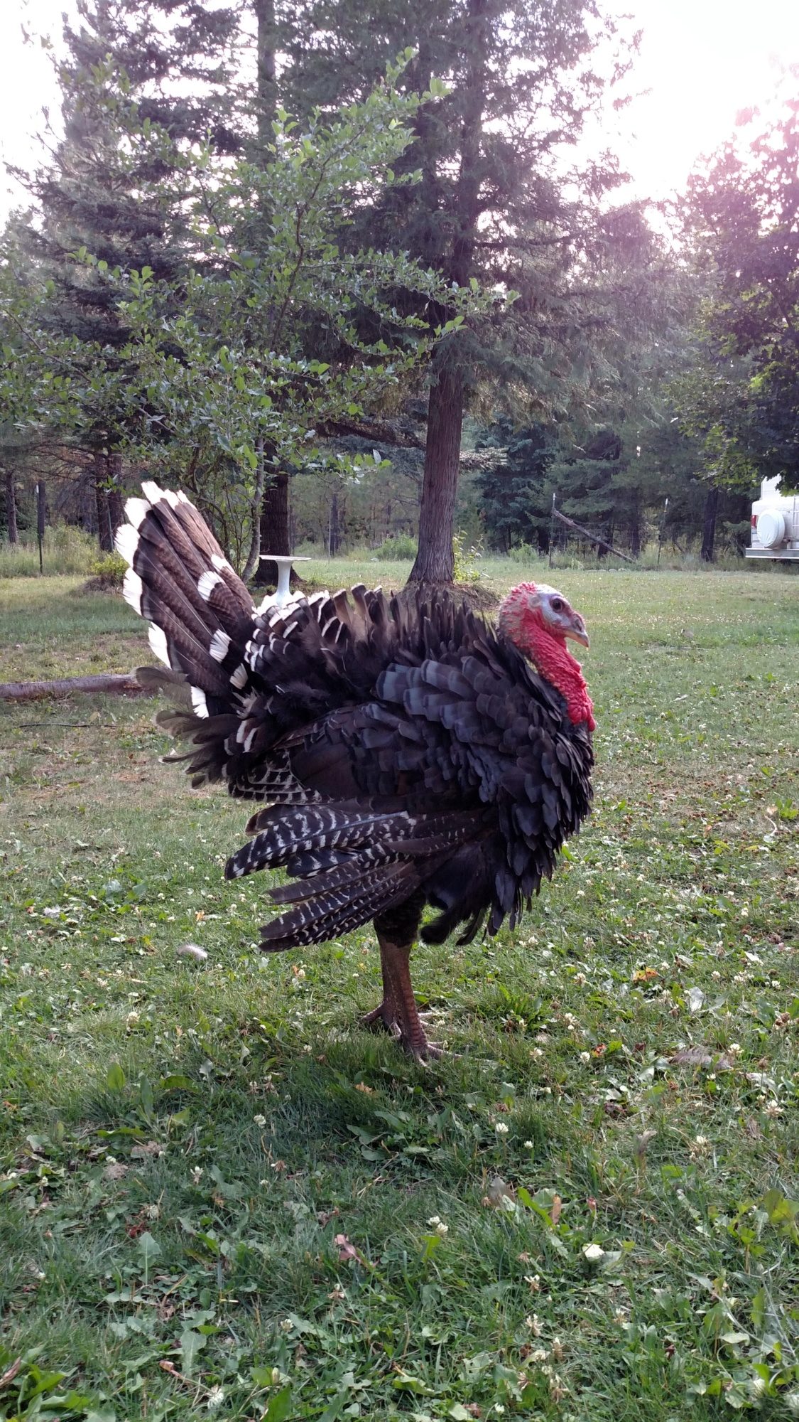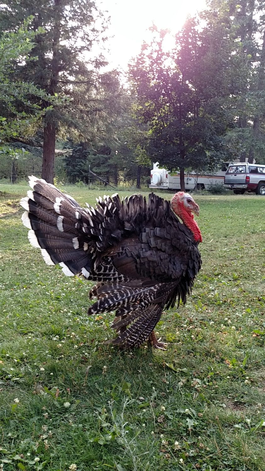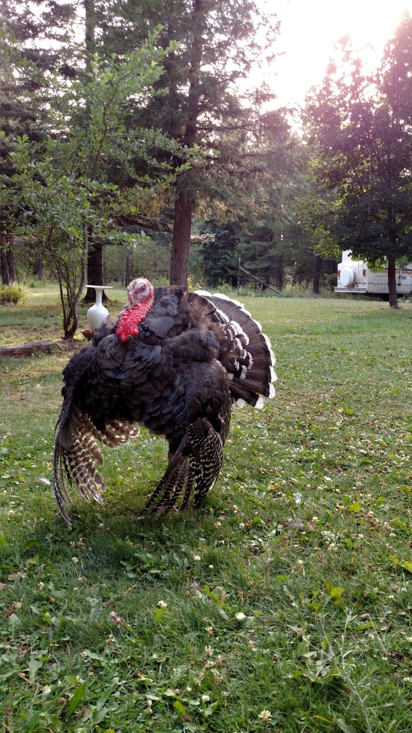 I took the chicken eggs away from my turkey hens Thursday. They had 3, but not the original ones. They smashed a bunch, stole more, had a bunch disappear. I couldn't keep track. Looked like they all started, but quit. They were all pullet eggs. So I took out the dog houses the turkeys use. Now they are stuffing themselves in the chicken boxes anytime they find an egg. I've been checking several times a day since one will sit on an egg and the other sits on top of the first one. Today I watched one of them shove her head under a hen and search for an egg. She tried pulling the egg out of the box, then she was lifting the chicken and trying to shove her out with her head. I went over and rescued both the egg and the chicken. It's too hot for sitting. I hope I can convince them to wait until closer to fall.